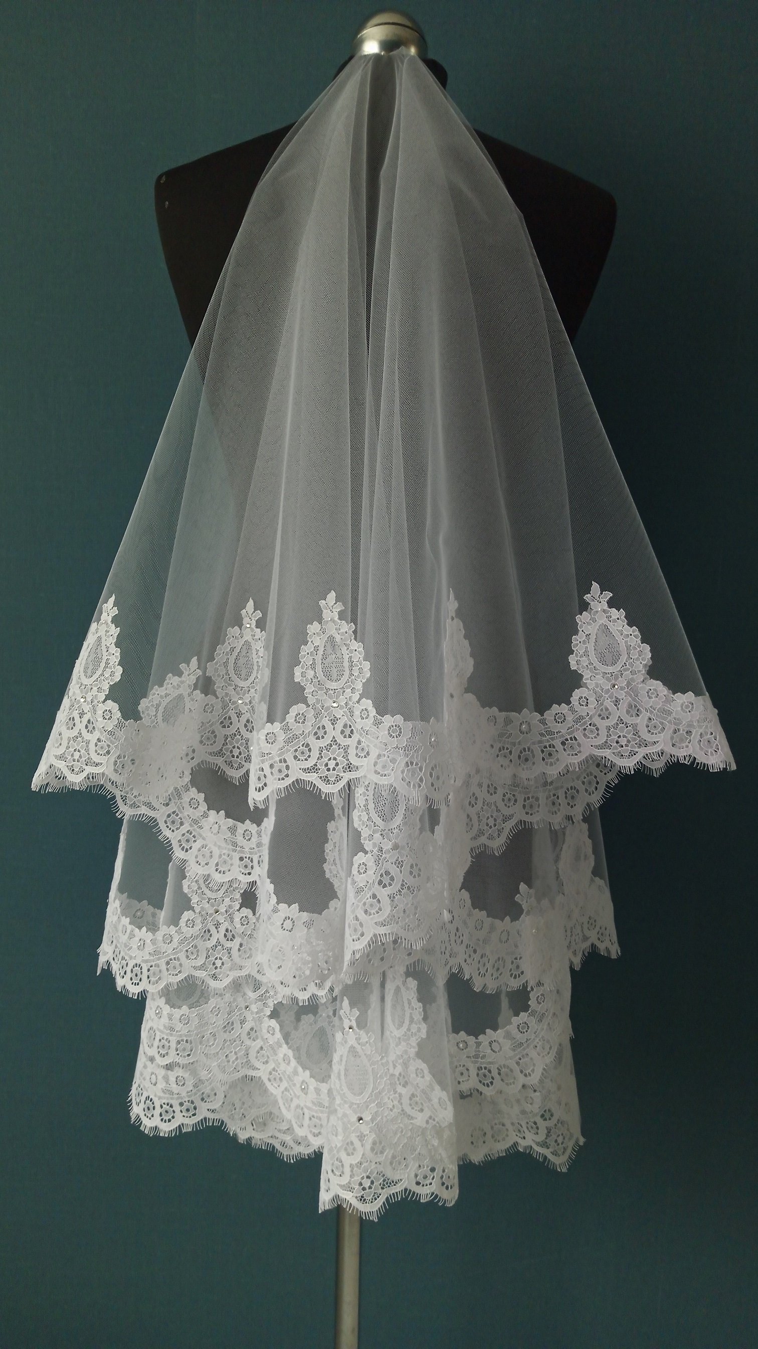 Фата 2-х ярусная, размер 1,5х1,5 метра ( длина верхнего слоя - 60 см, нижнего - 90 см ). Оформлена кружевом "шантильи" и украшена стразами,жемчугом. |