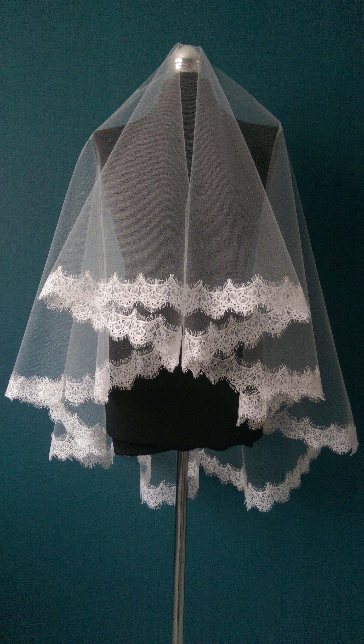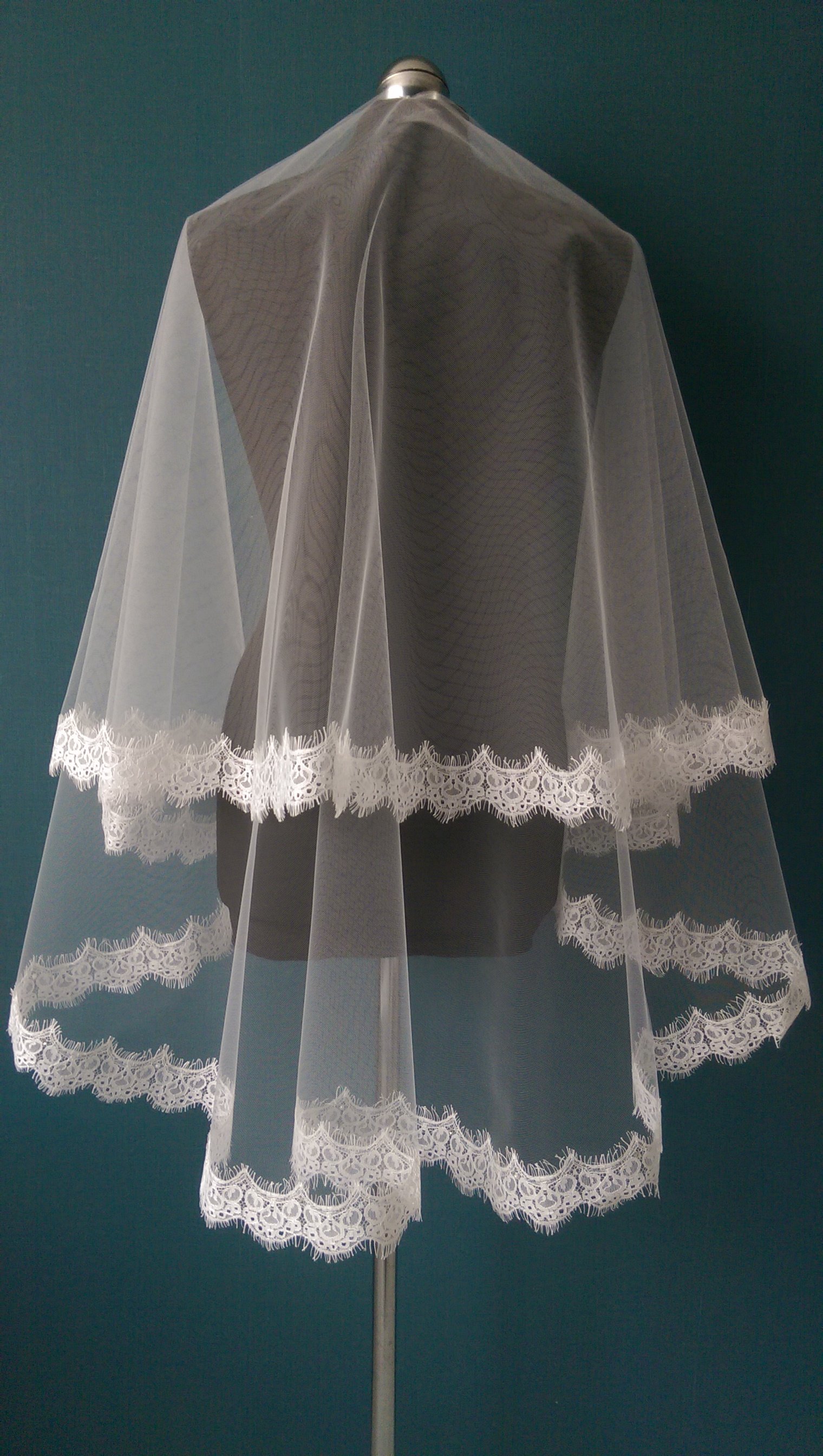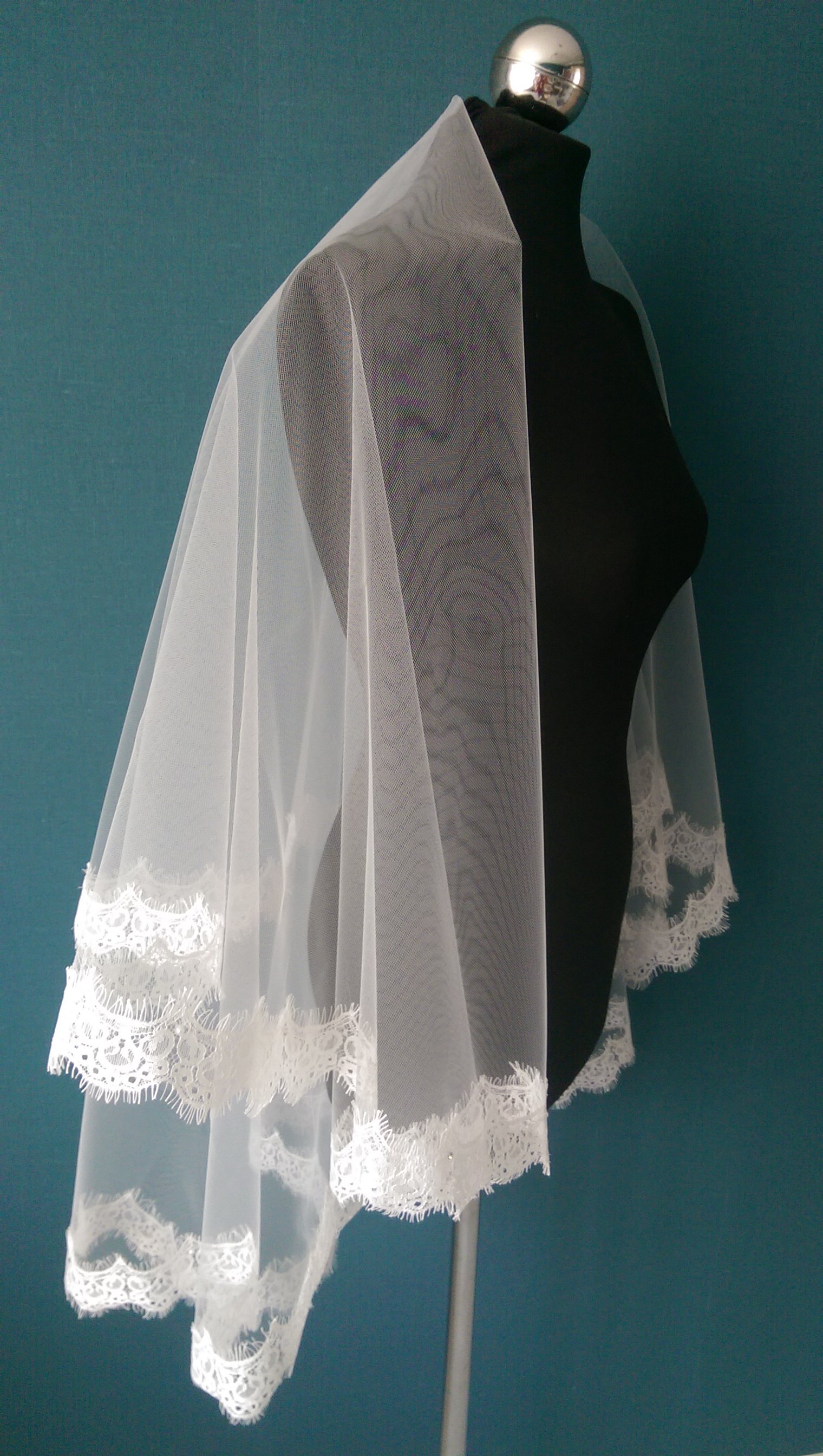 | Особенности | Фата 2-х ярусная, размер 1,5х1,5 метра ( длина верхнего слоя - 60 см, нижнего - 90 см ). Оформлена кружевом "шантильи" и украшена стразами,жемчугом. |