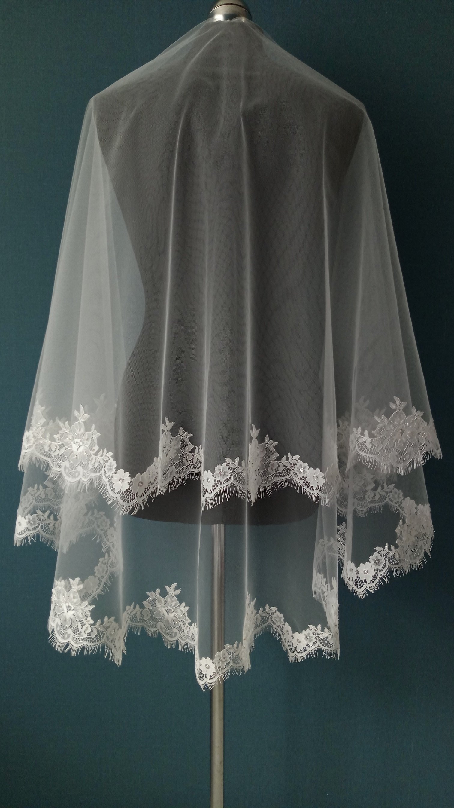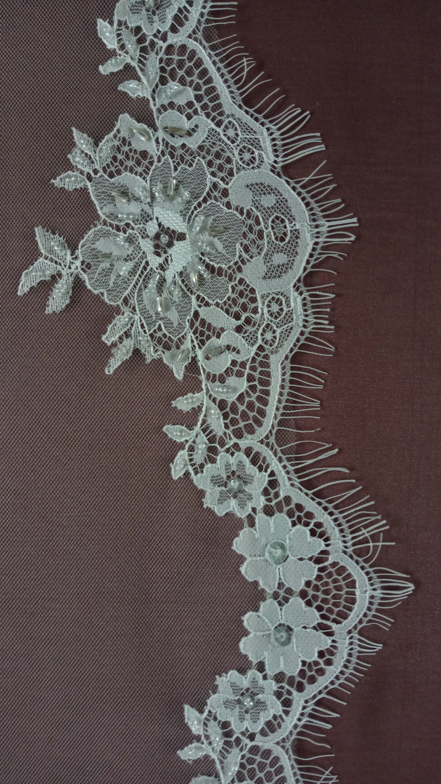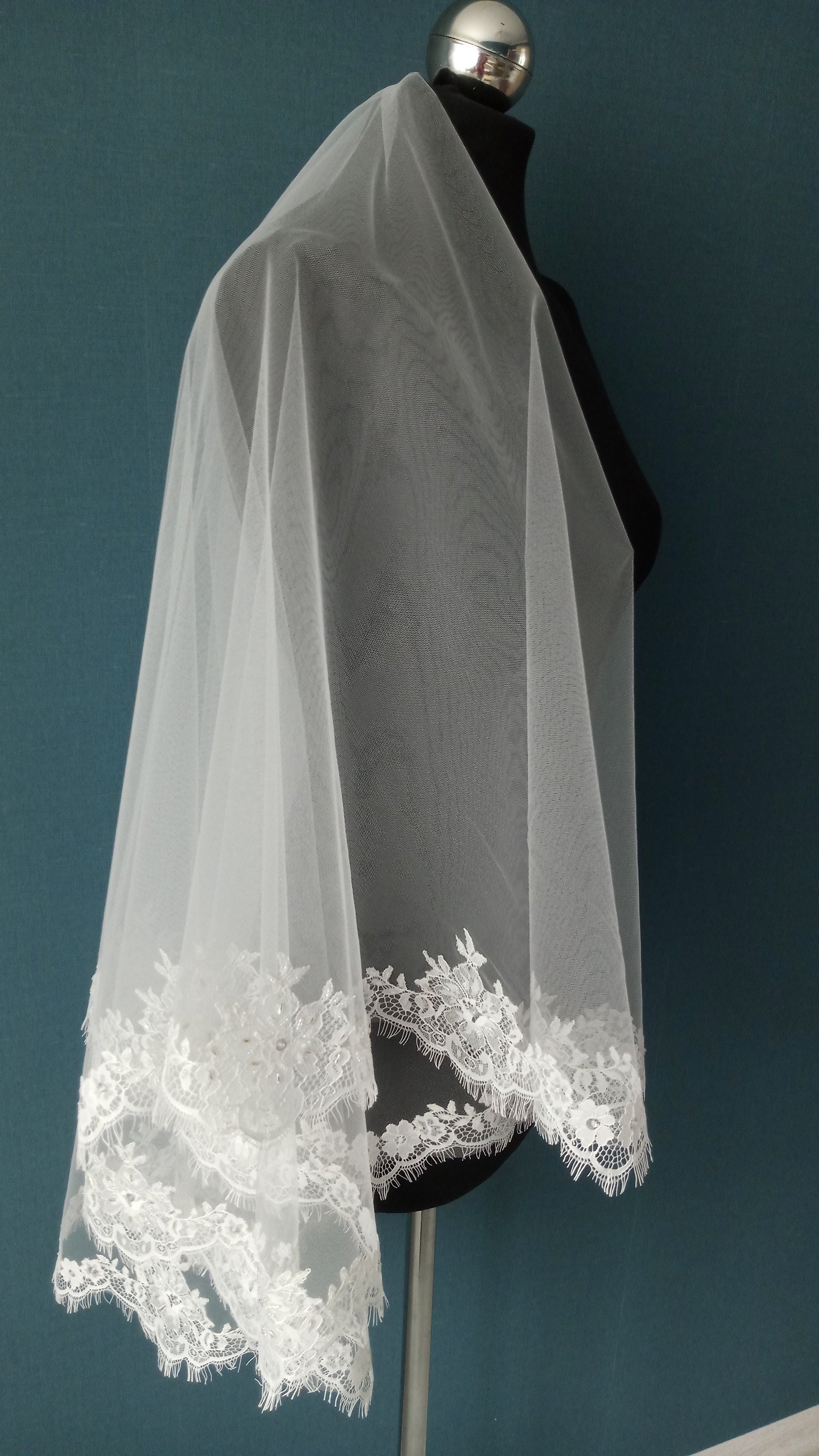 Особенности Фата 2-х ярусная, размер 1,5х1,5 метра ( длина верхнего слоя - 60 см, нижнего - 90 см ). Оформлена кружевом "шантильи" ,вручную расшита бисером,бусинами,паетками.