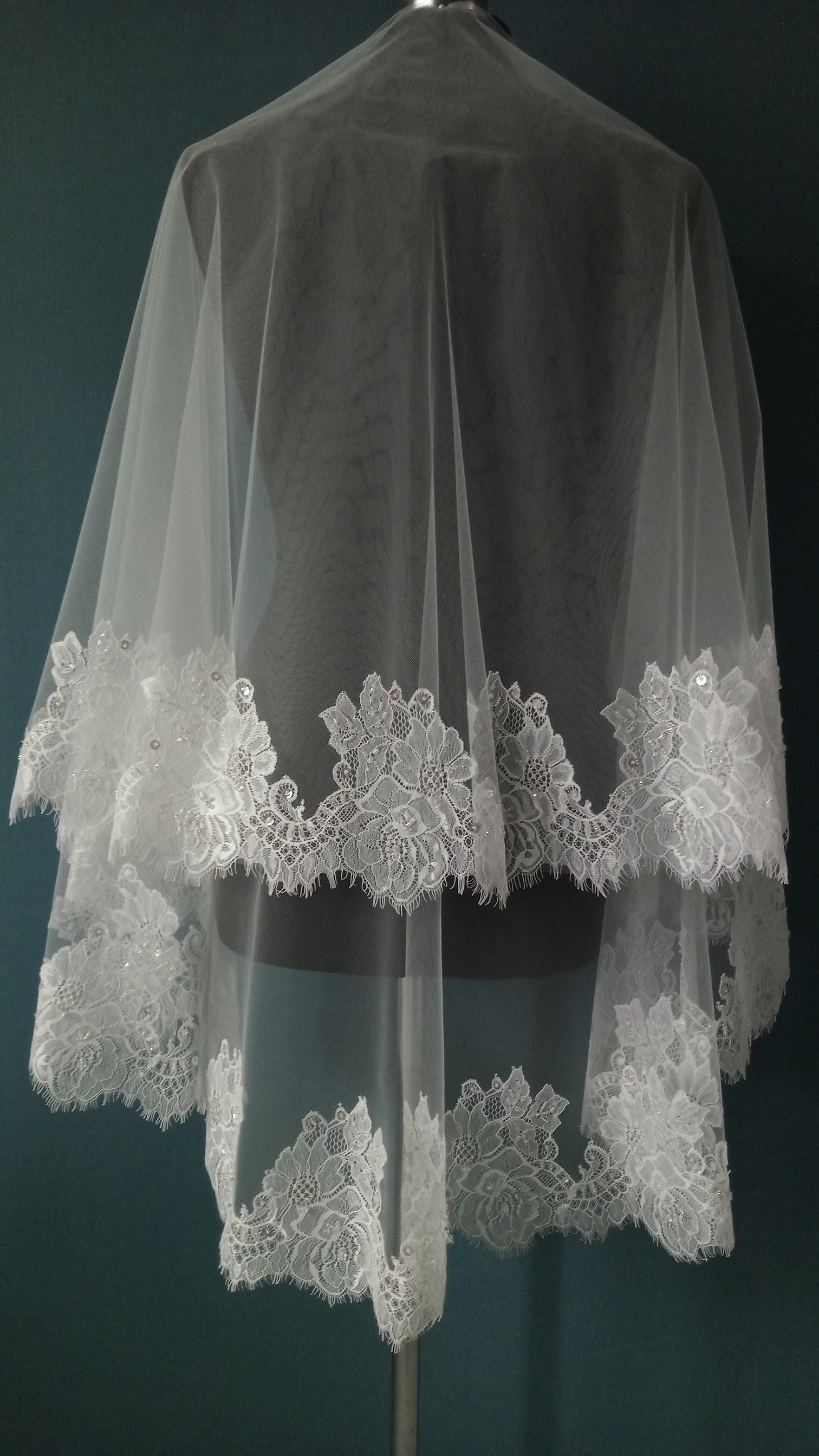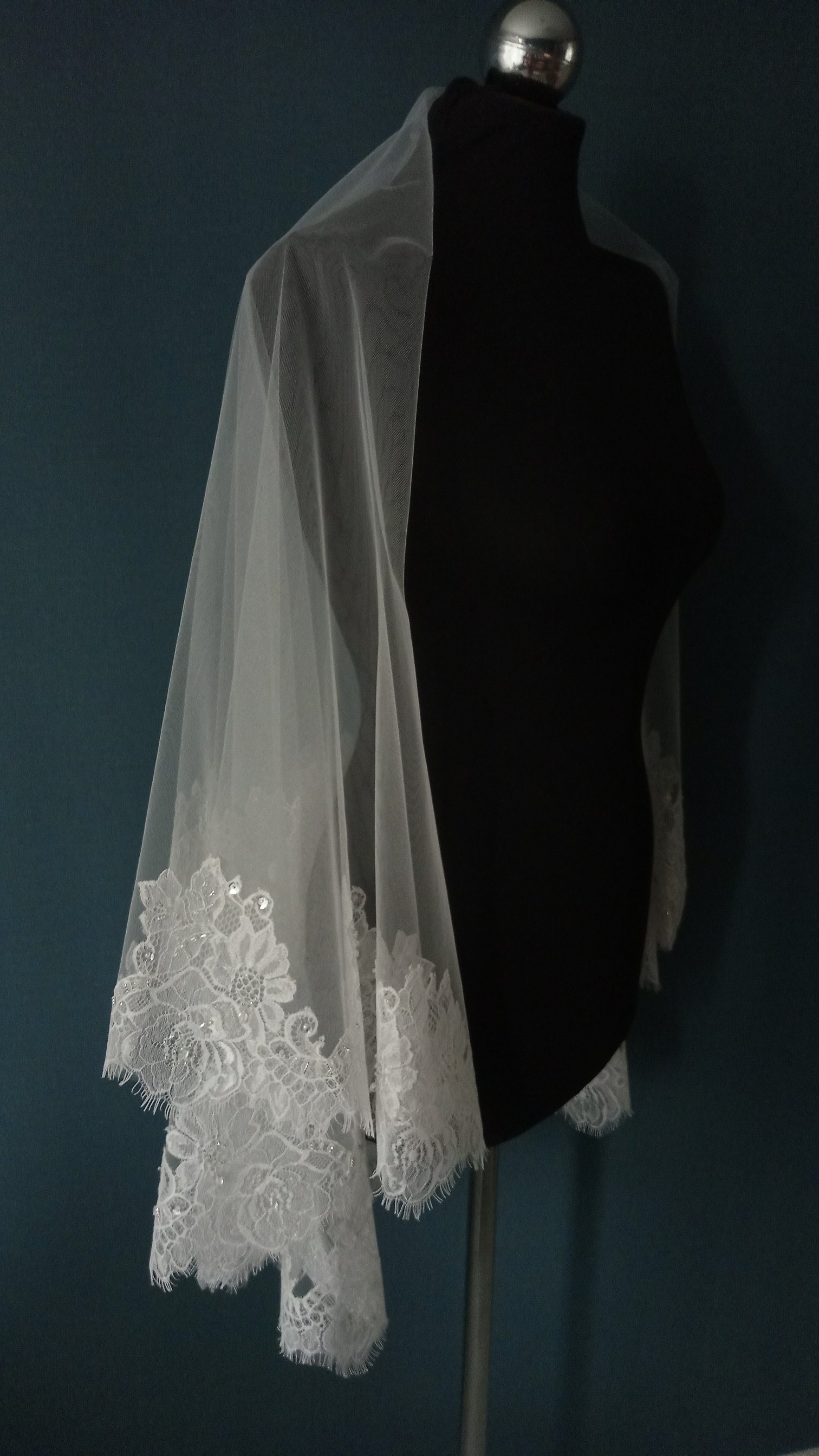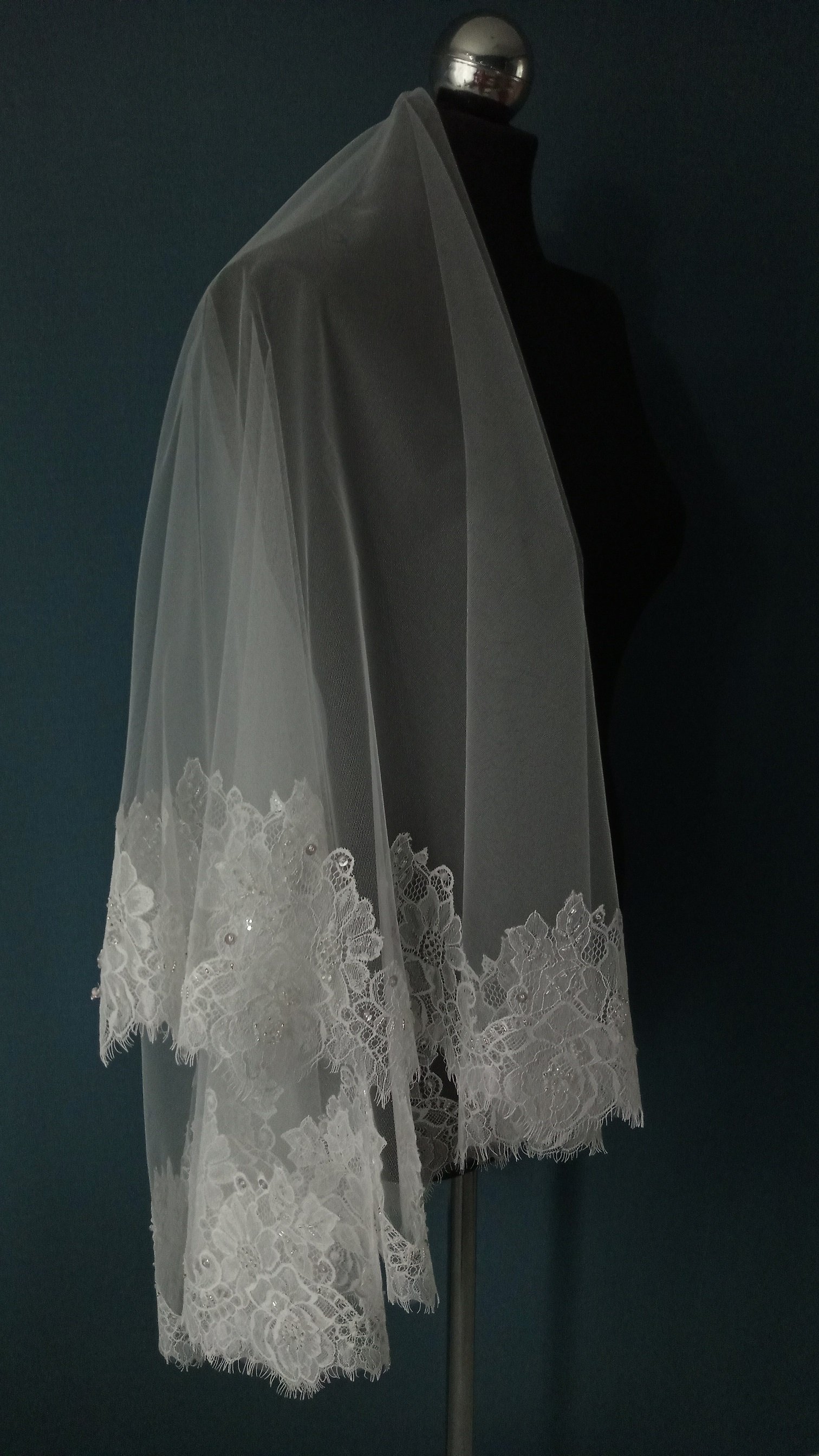 Особенности Фата 2-х ярусная, размер 1,5х1,5 метра ( длина верхнего слоя - 60 см, нижнего - 90 см ). Оформлена кружевом "шантильи" ,вручную расшита бисером,бусинами,паетками.