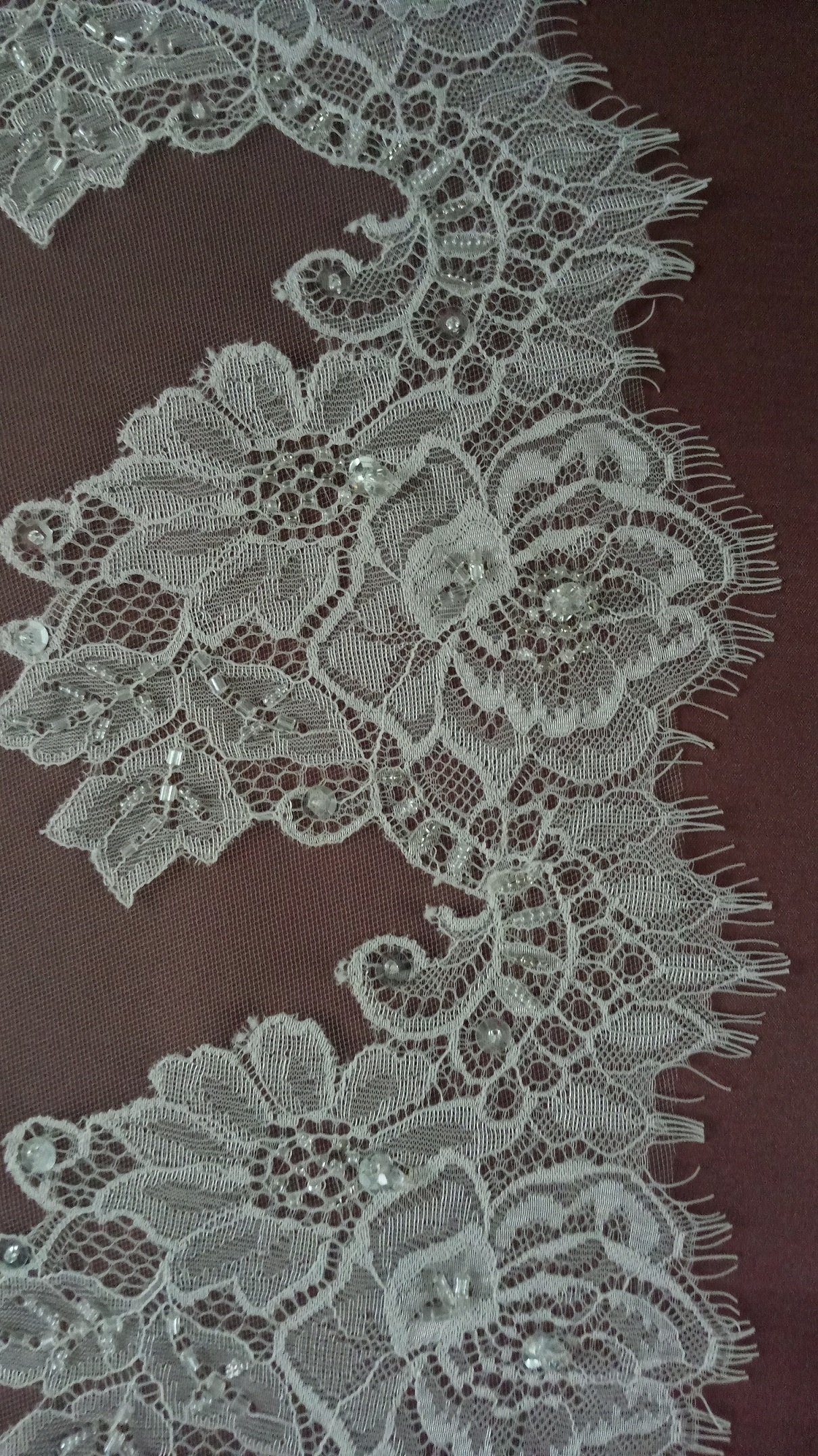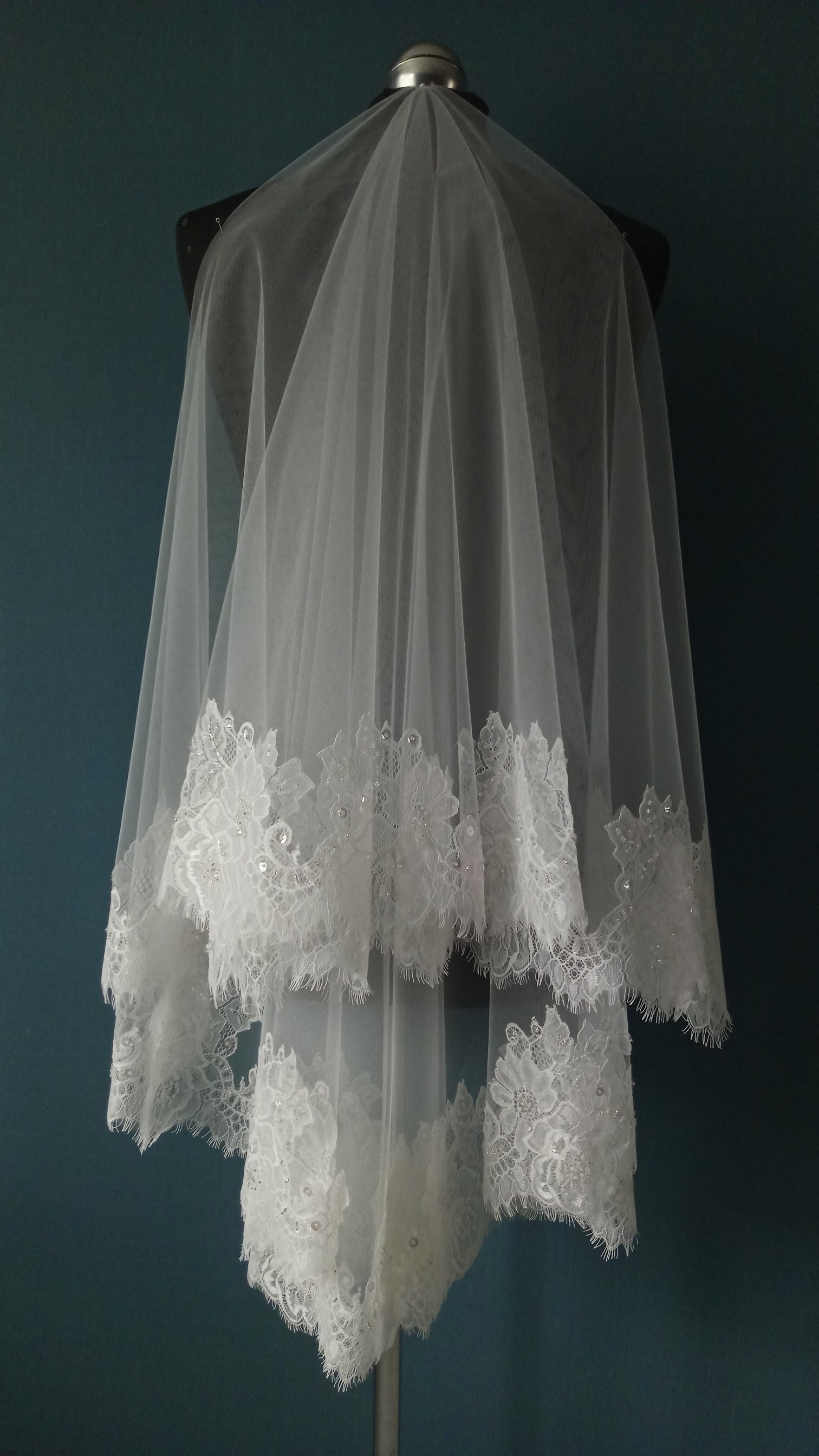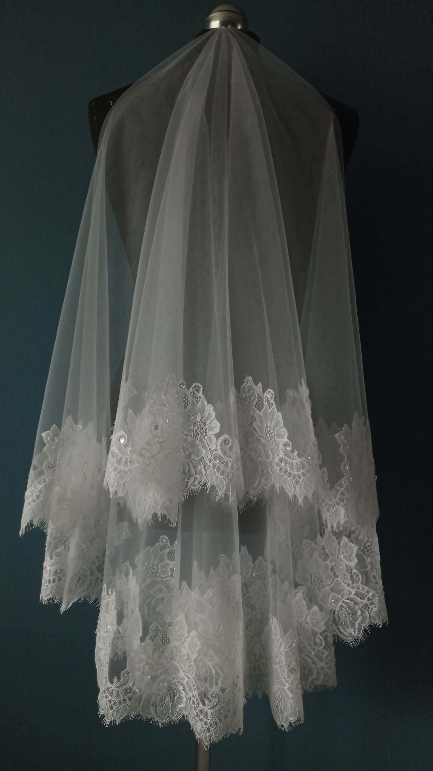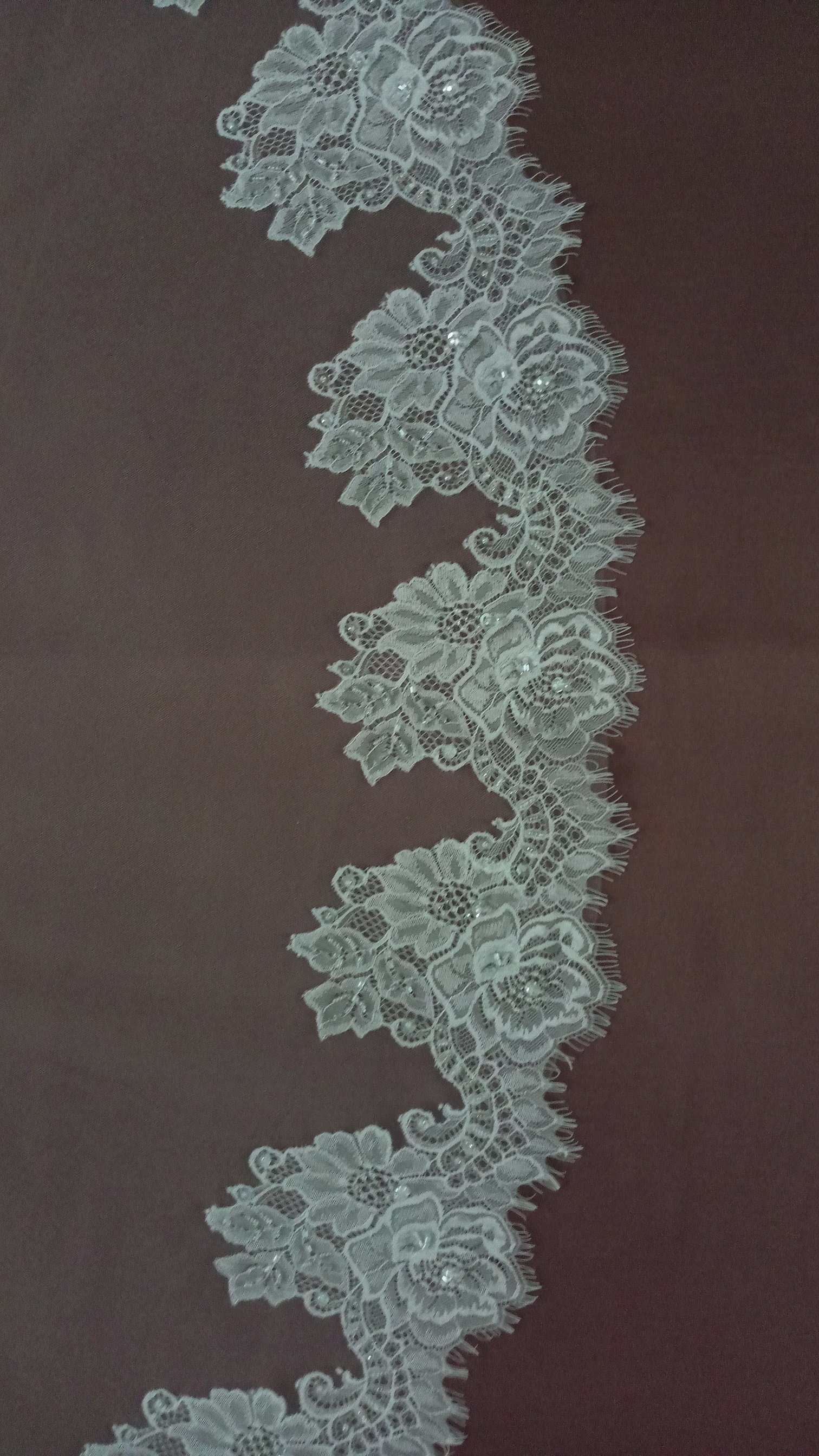 Особенности Фата 2-х ярусная, размер 1,5х1,5 метра ( длина верхнего слоя - 60 см, нижнего - 90 см ). Оформлена кружевом "шантильи" ,вручную расшита бисером,бусинами,паетками.