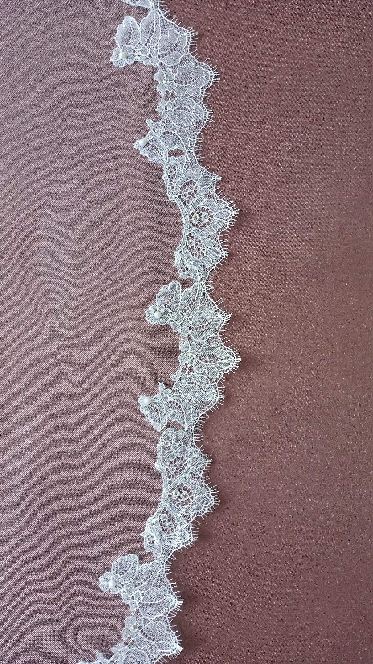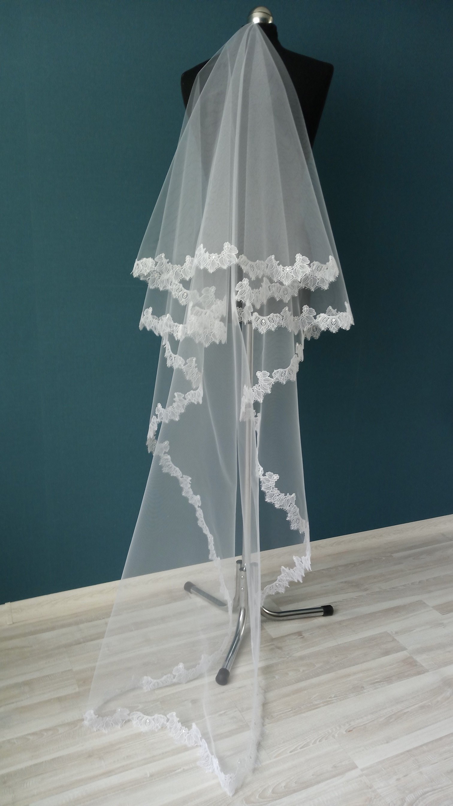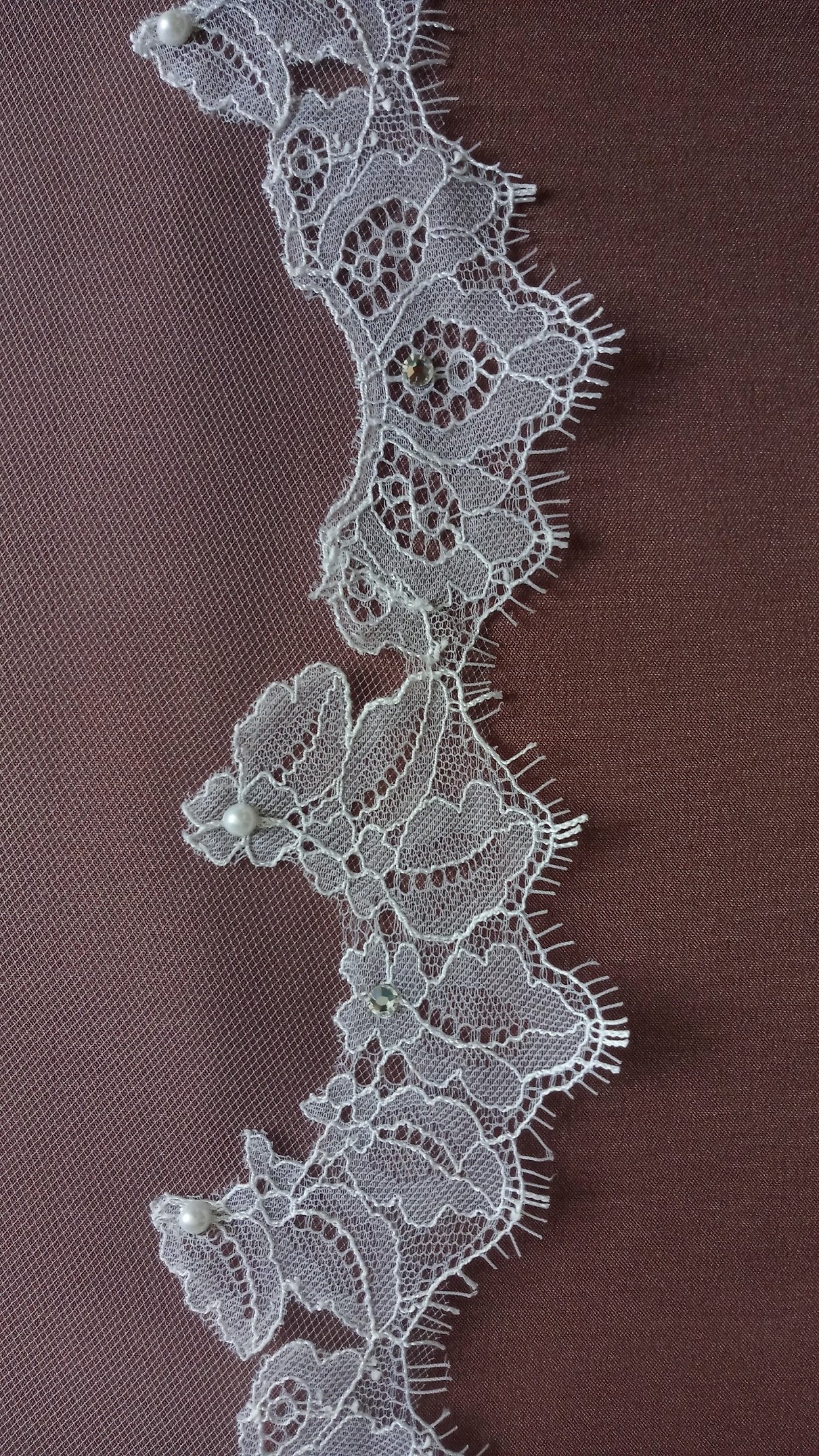 Особенности Фата 2-х ярусная, размер 1,5х2,3 метра ( длина верхнего слоя - 60 см, нижнего - 170 см ). Оформлена кружевом "шантильи" и украшена стразами,жемчугом.