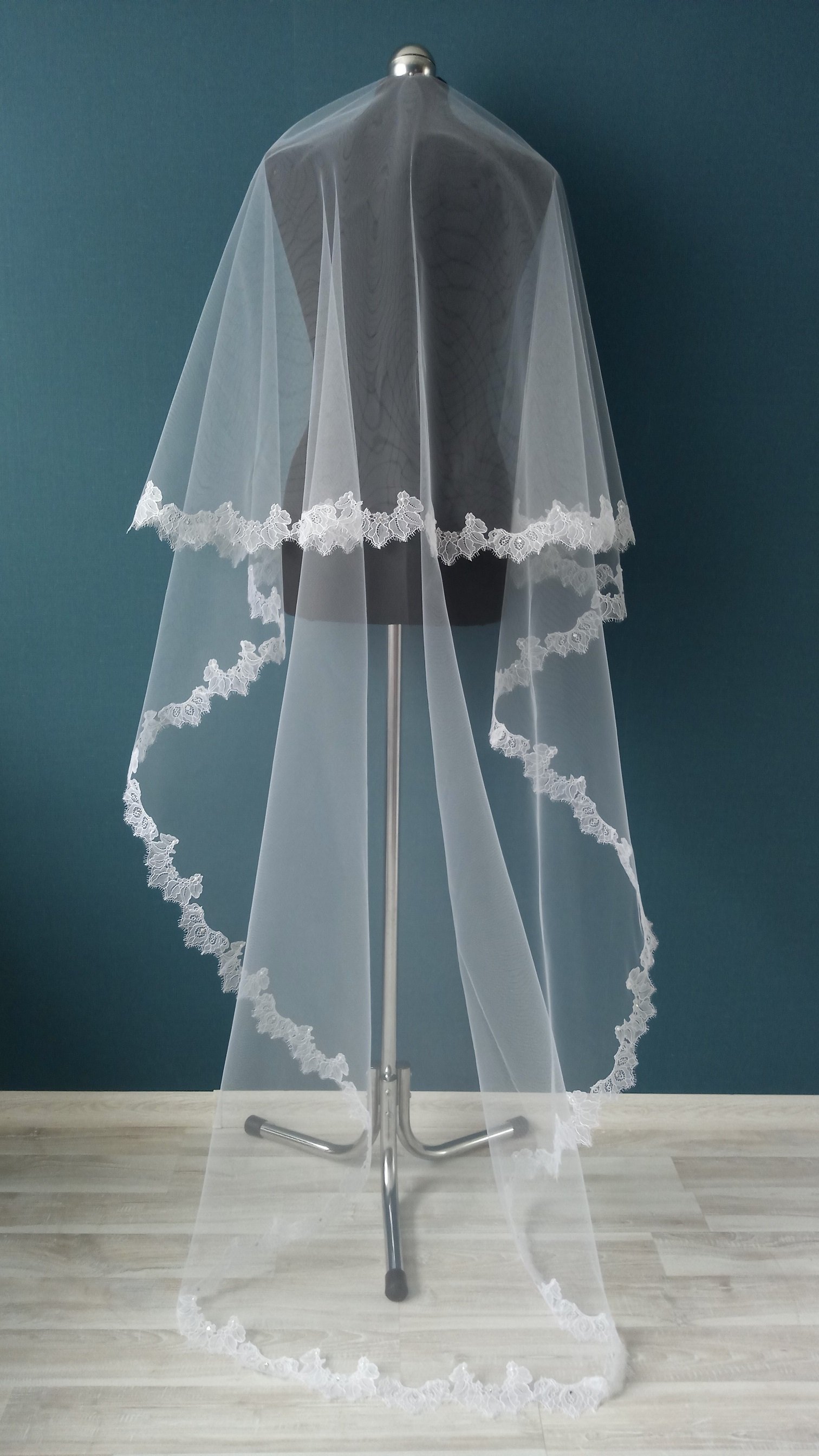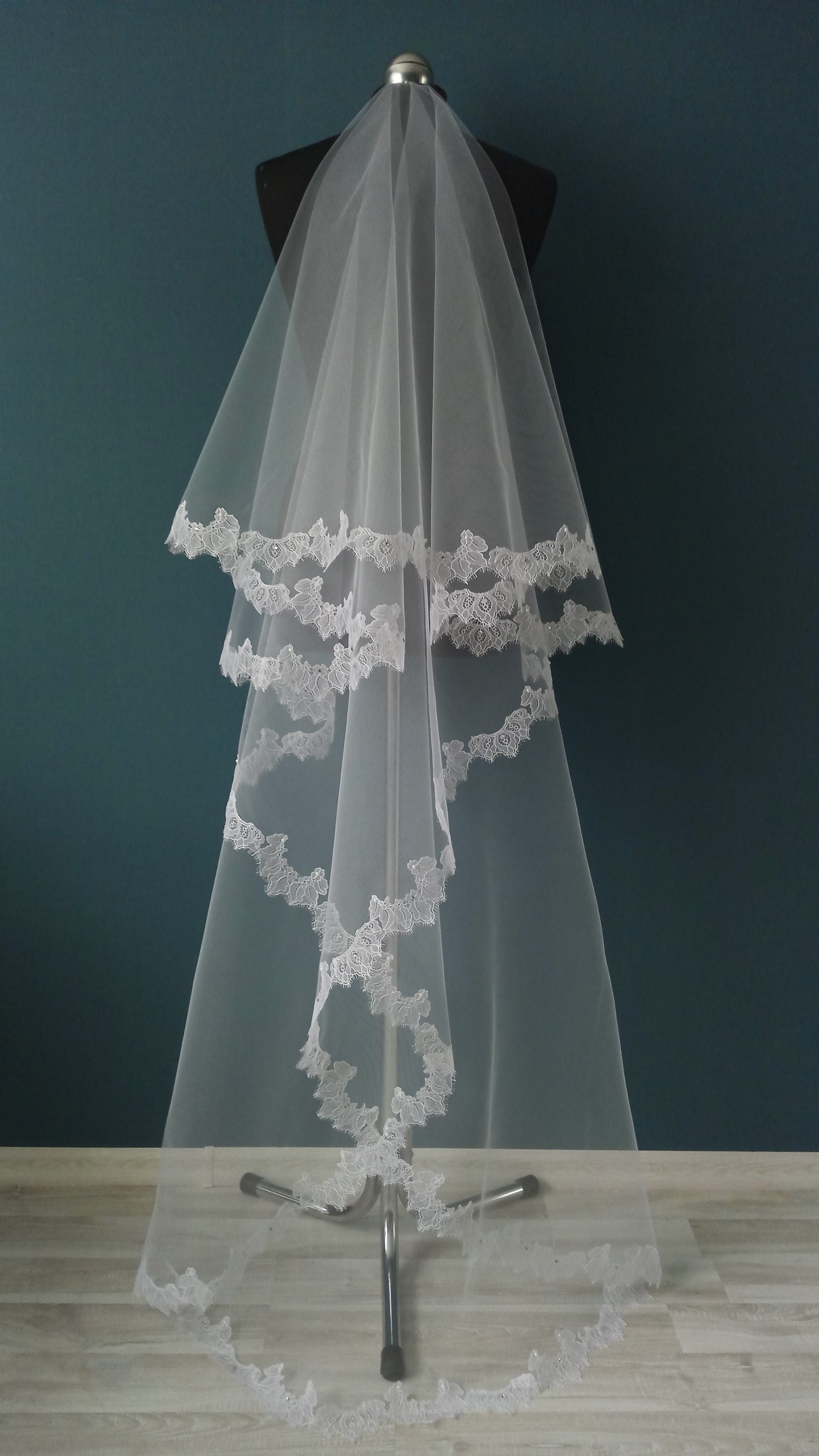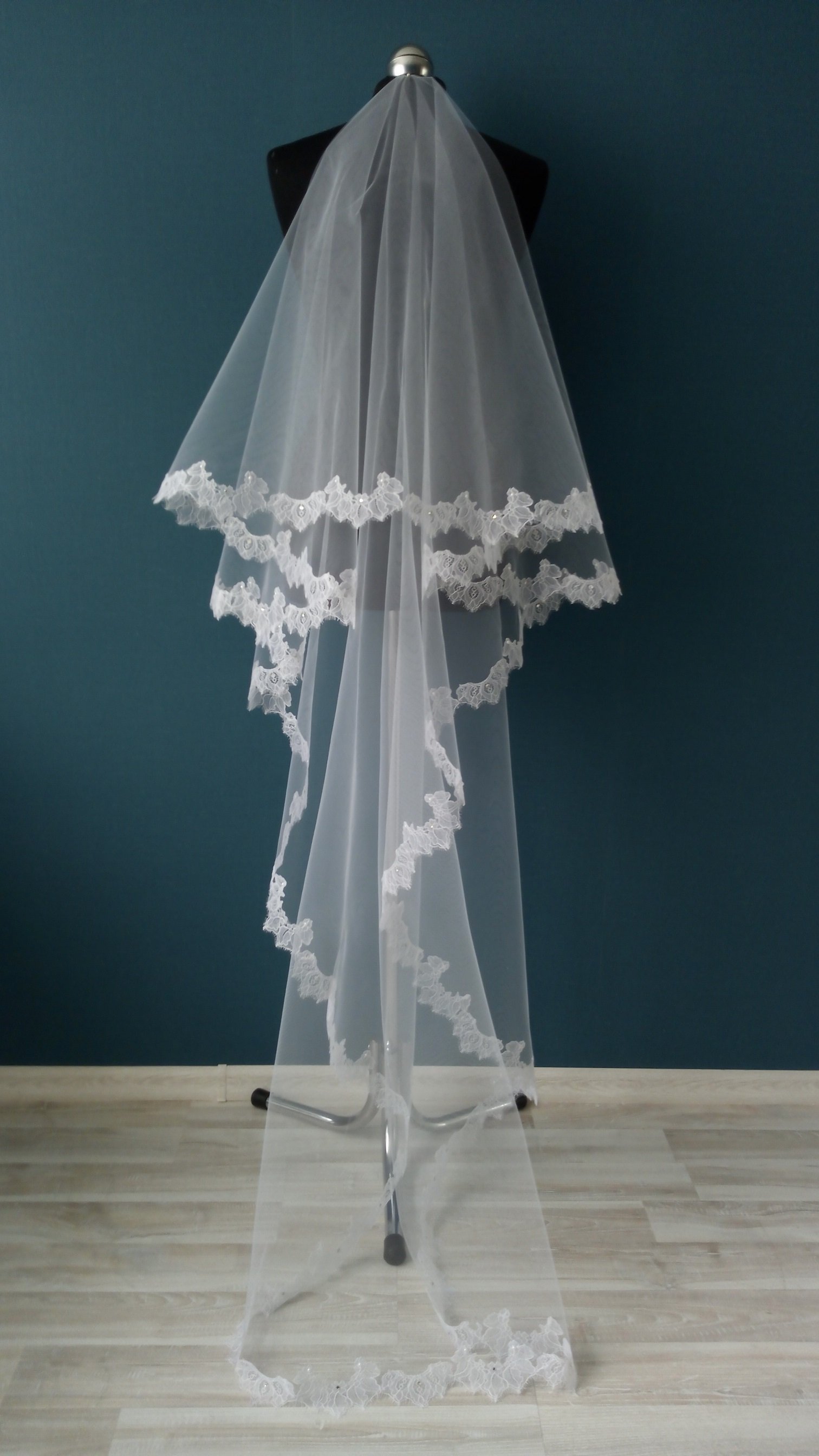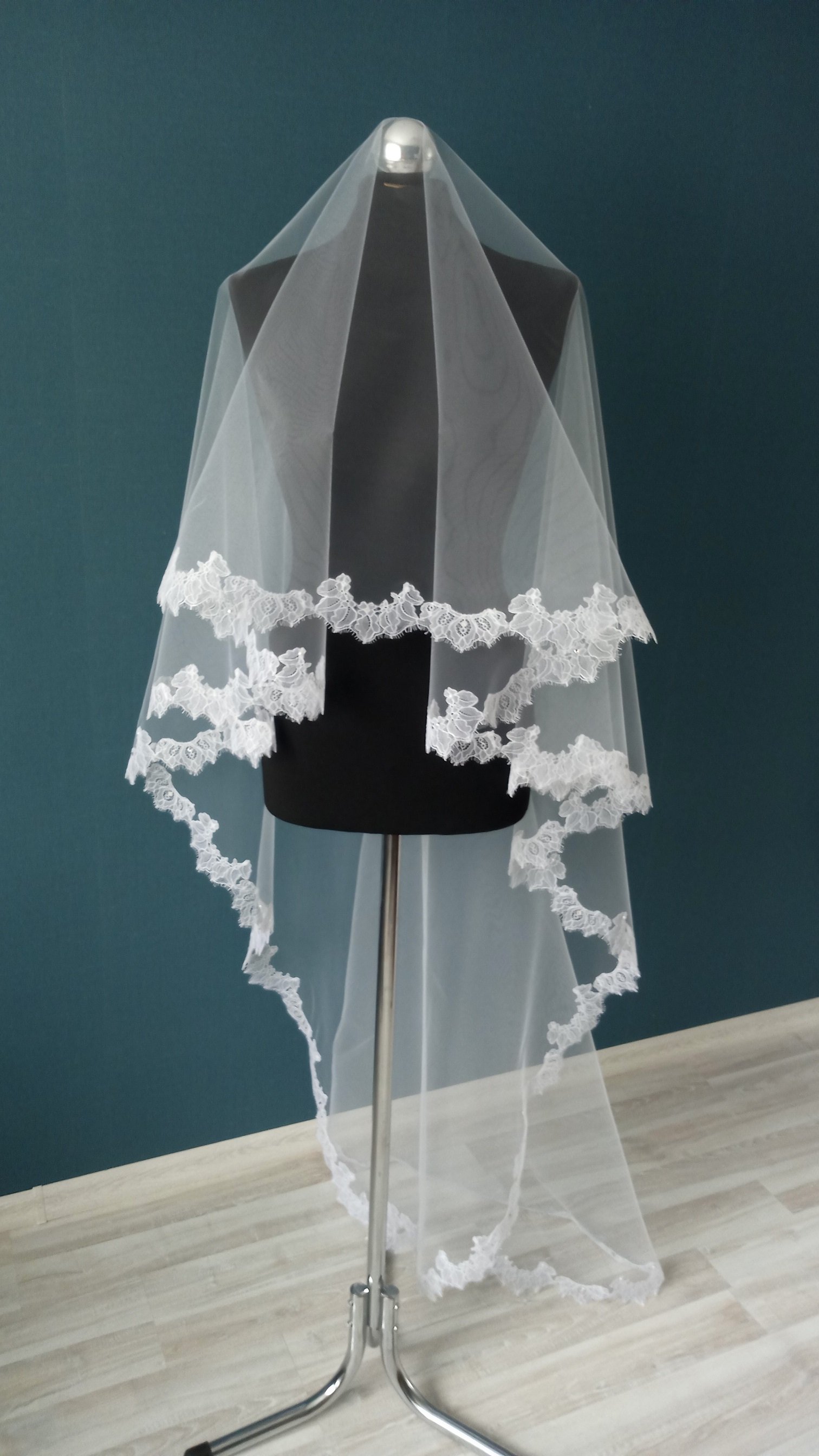 Особенности Фата 2-х ярусная, размер 1,5х2,3 метра ( длина верхнего слоя - 60 см, нижнего - 170 см ). Оформлена кружевом "шантильи" и украшена стразами,жемчугом.