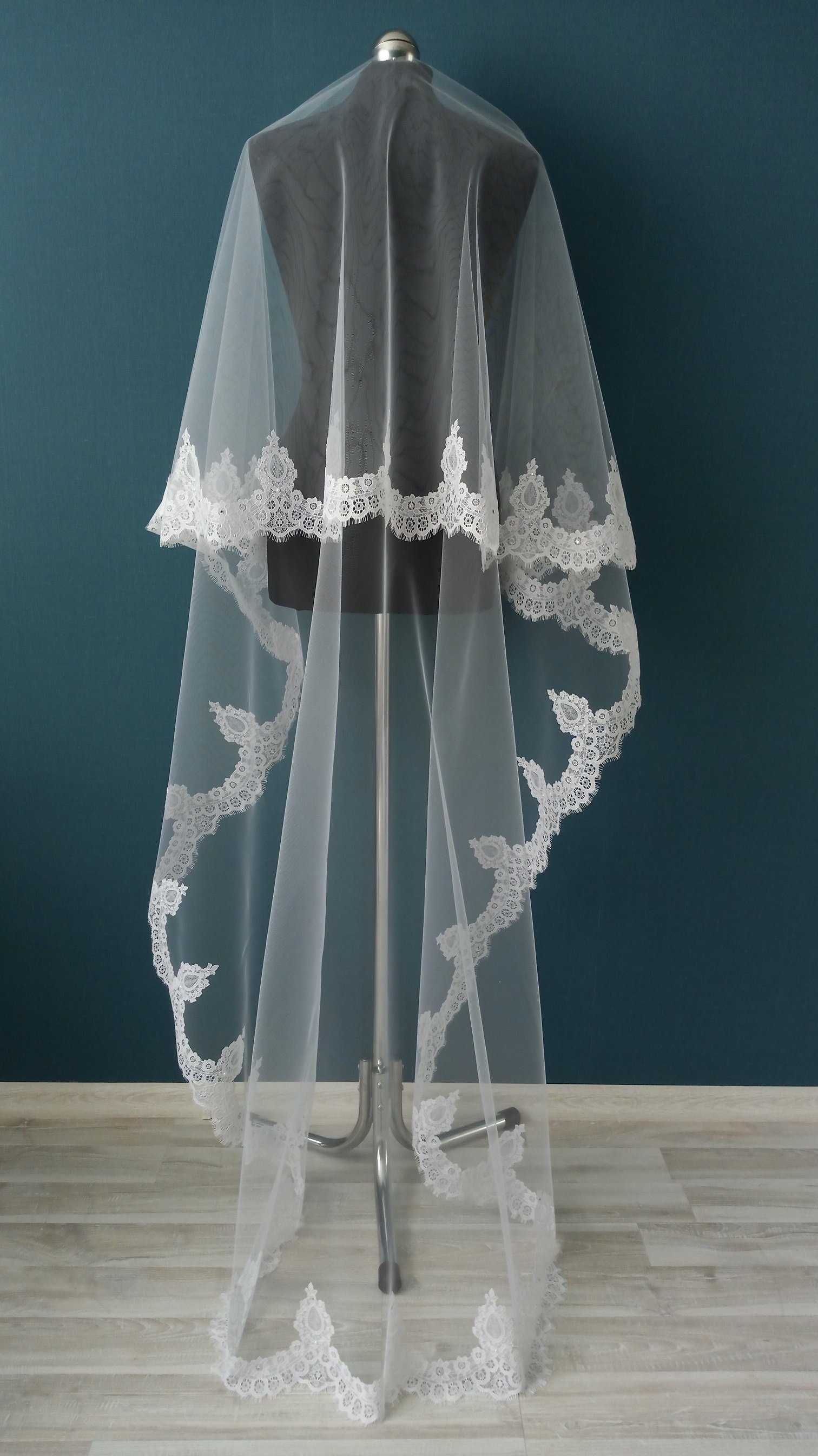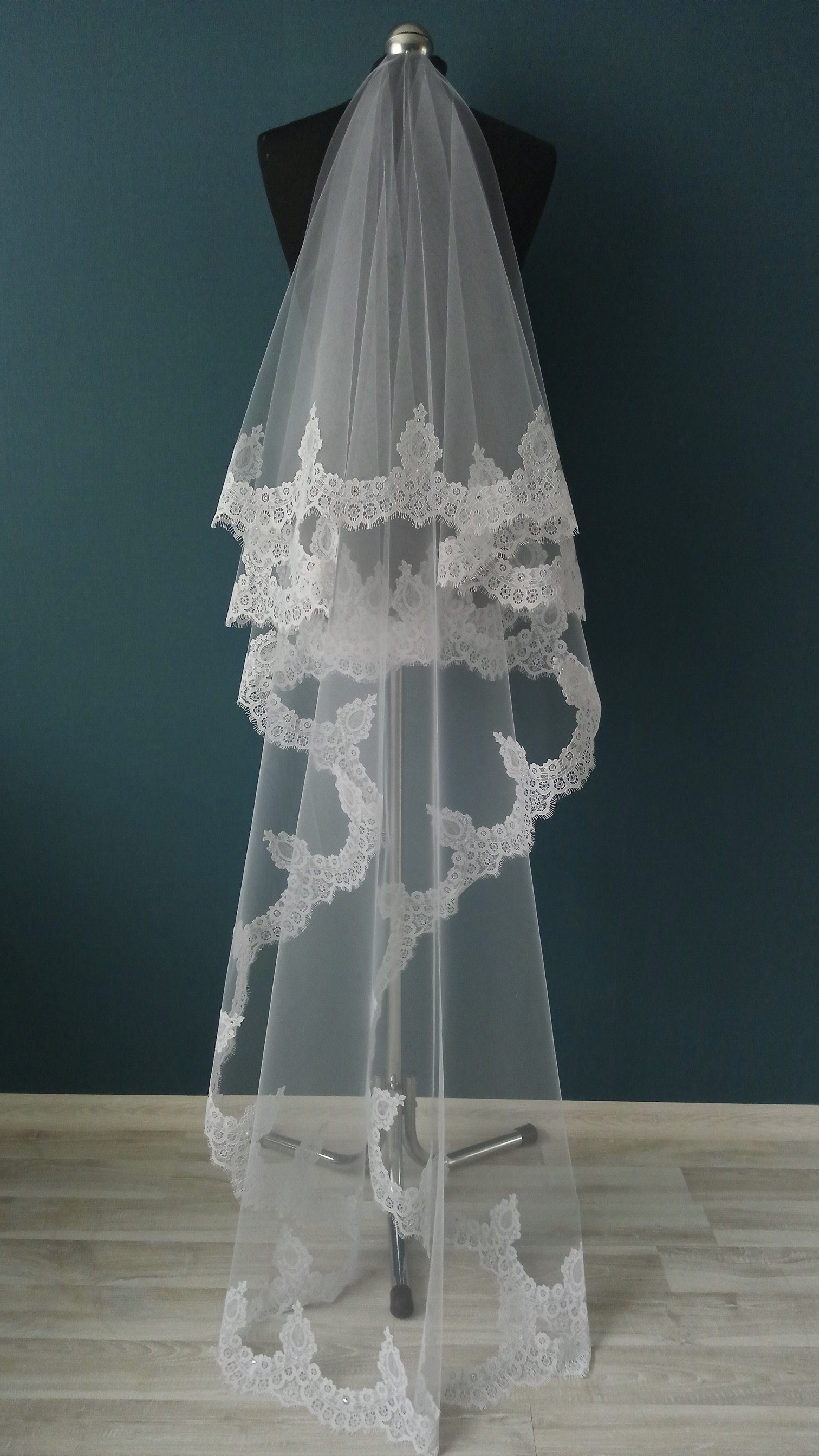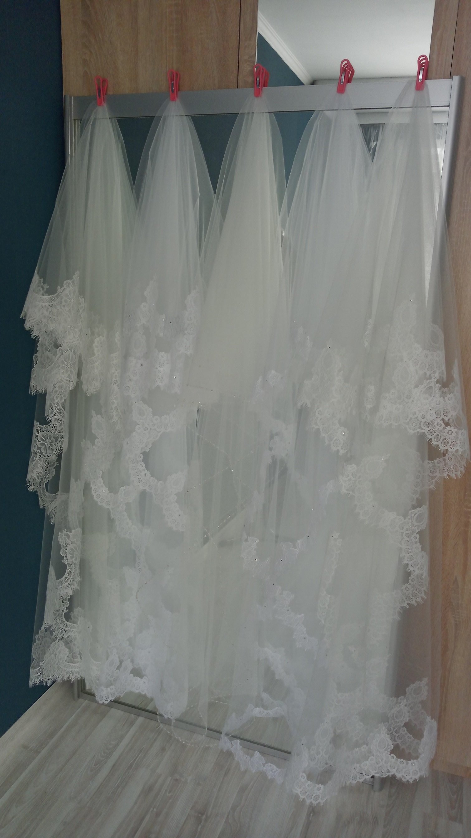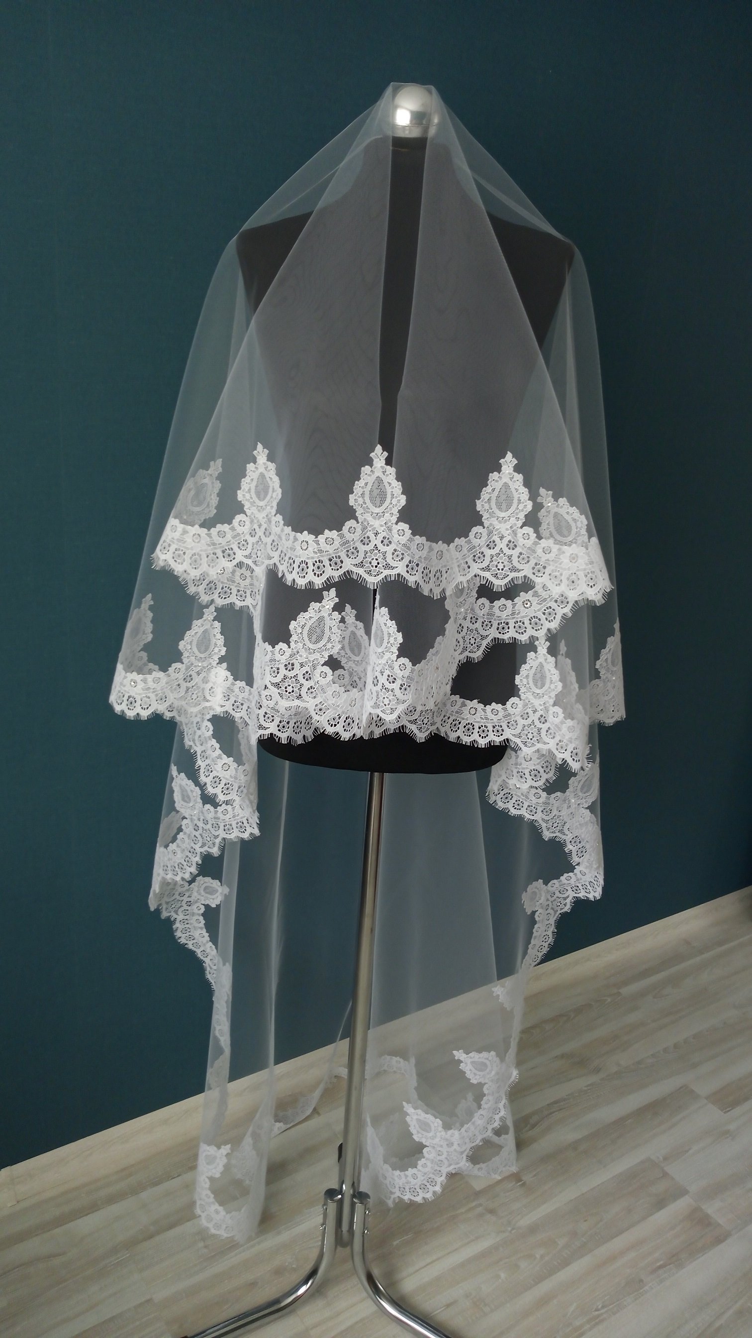 Особенности Фата 2-х ярусная, размер 1,5х2,3 метра ( длина верхнего слоя - 60 см, нижнего - 170 см ). Оформлена кружевом "шантильи" и украшена стразами,жемчугом.