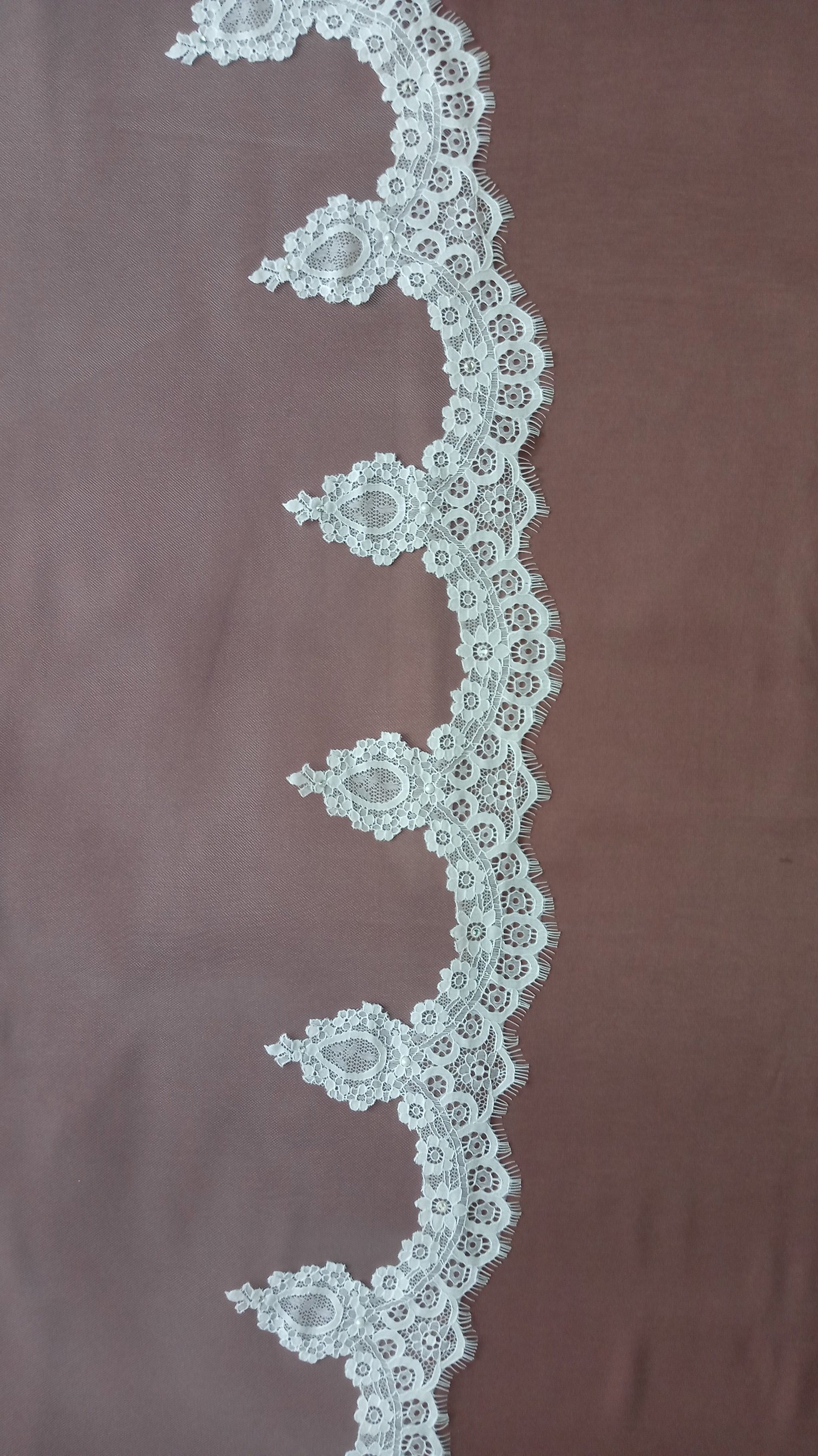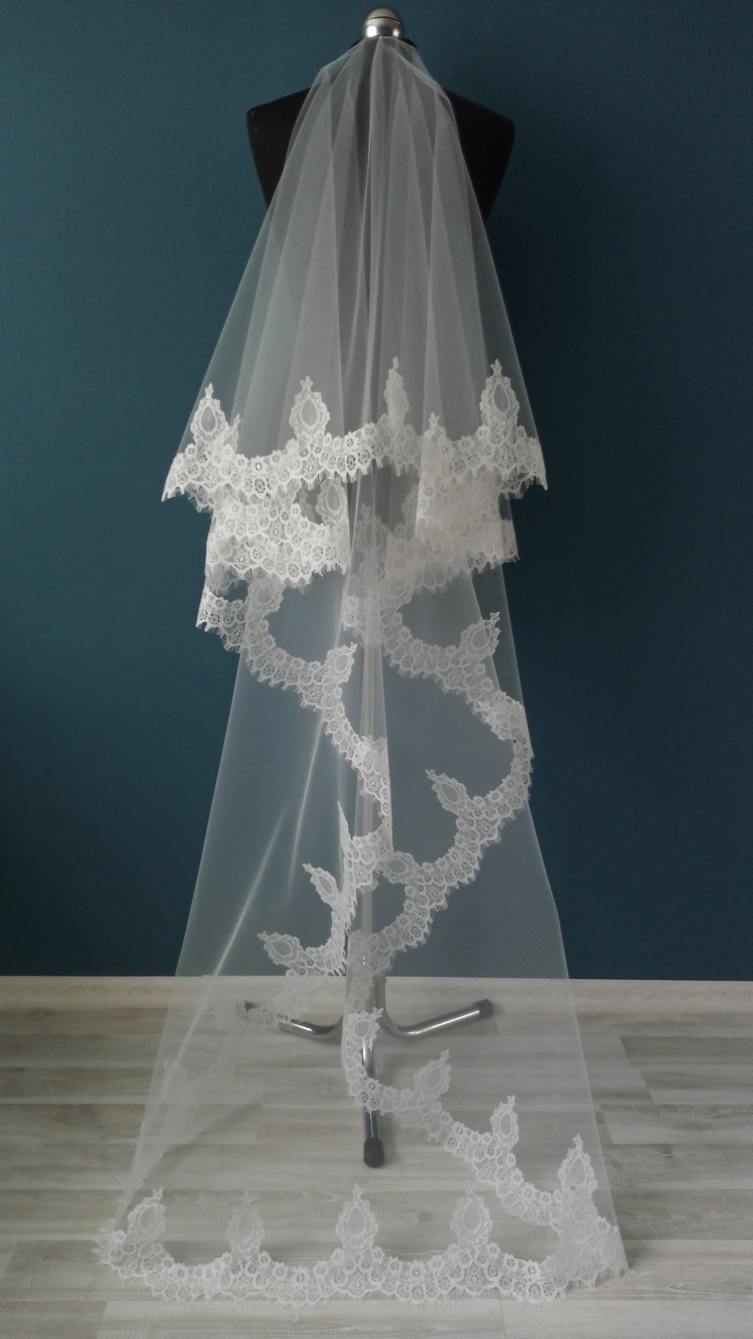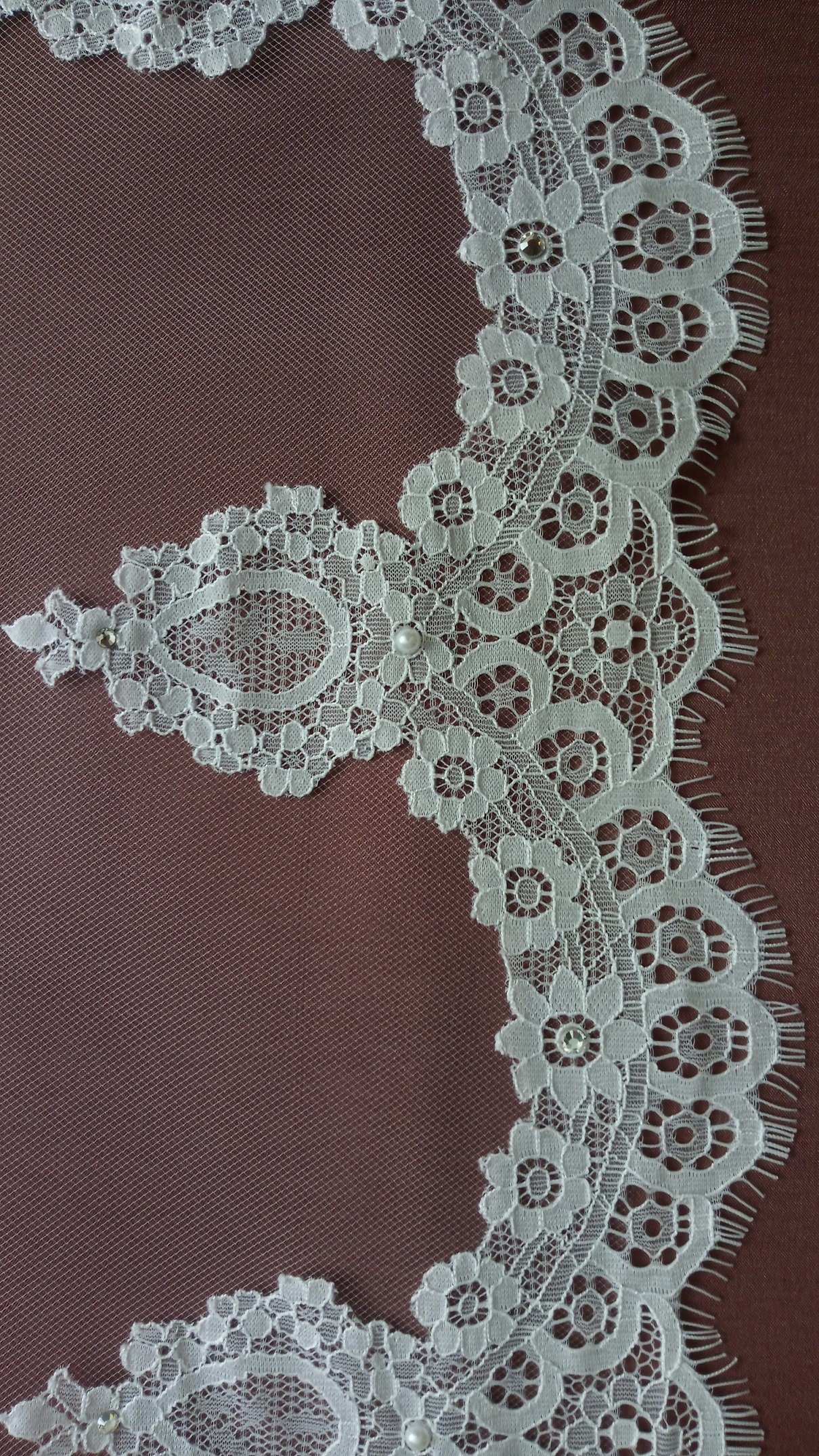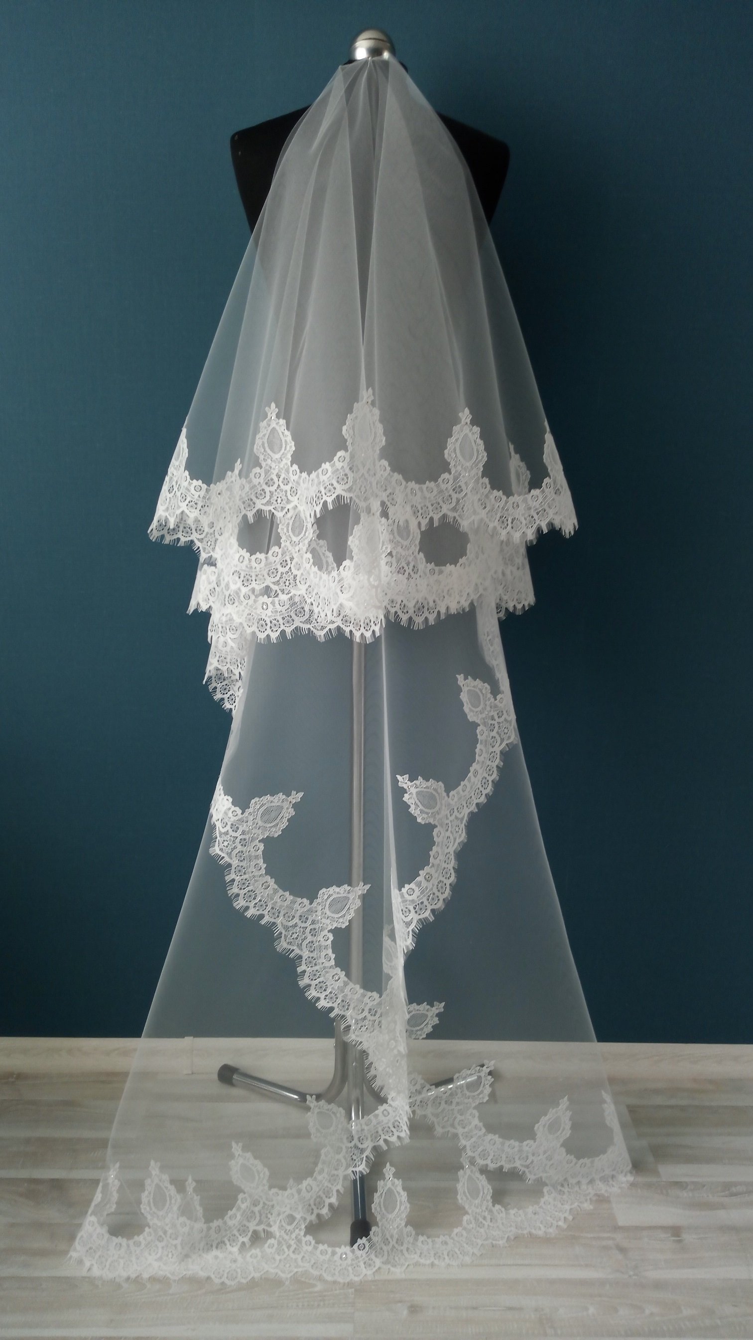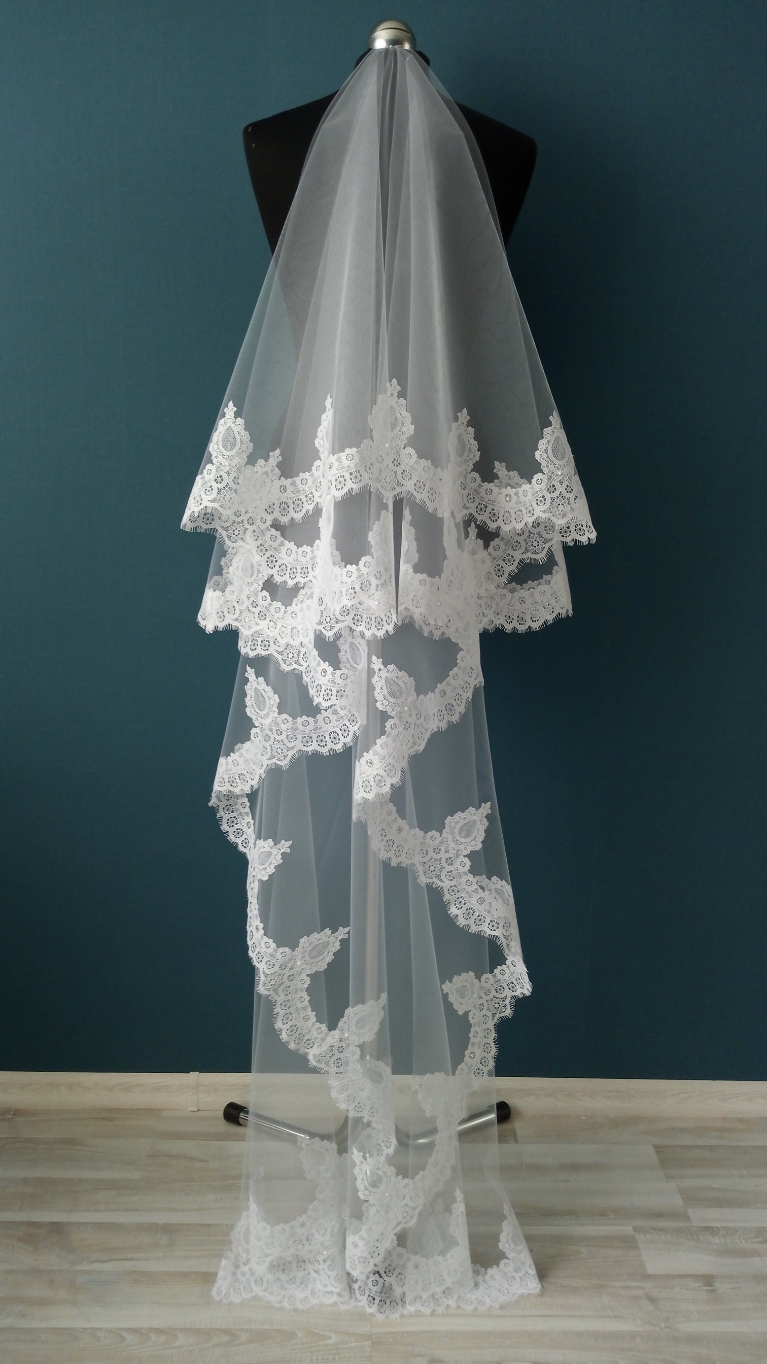 Особенности Фата 2-х ярусная, размер 1,5х2,3 метра ( длина верхнего слоя - 60 см, нижнего - 170 см ). Оформлена кружевом "шантильи" и украшена стразами,жемчугом.