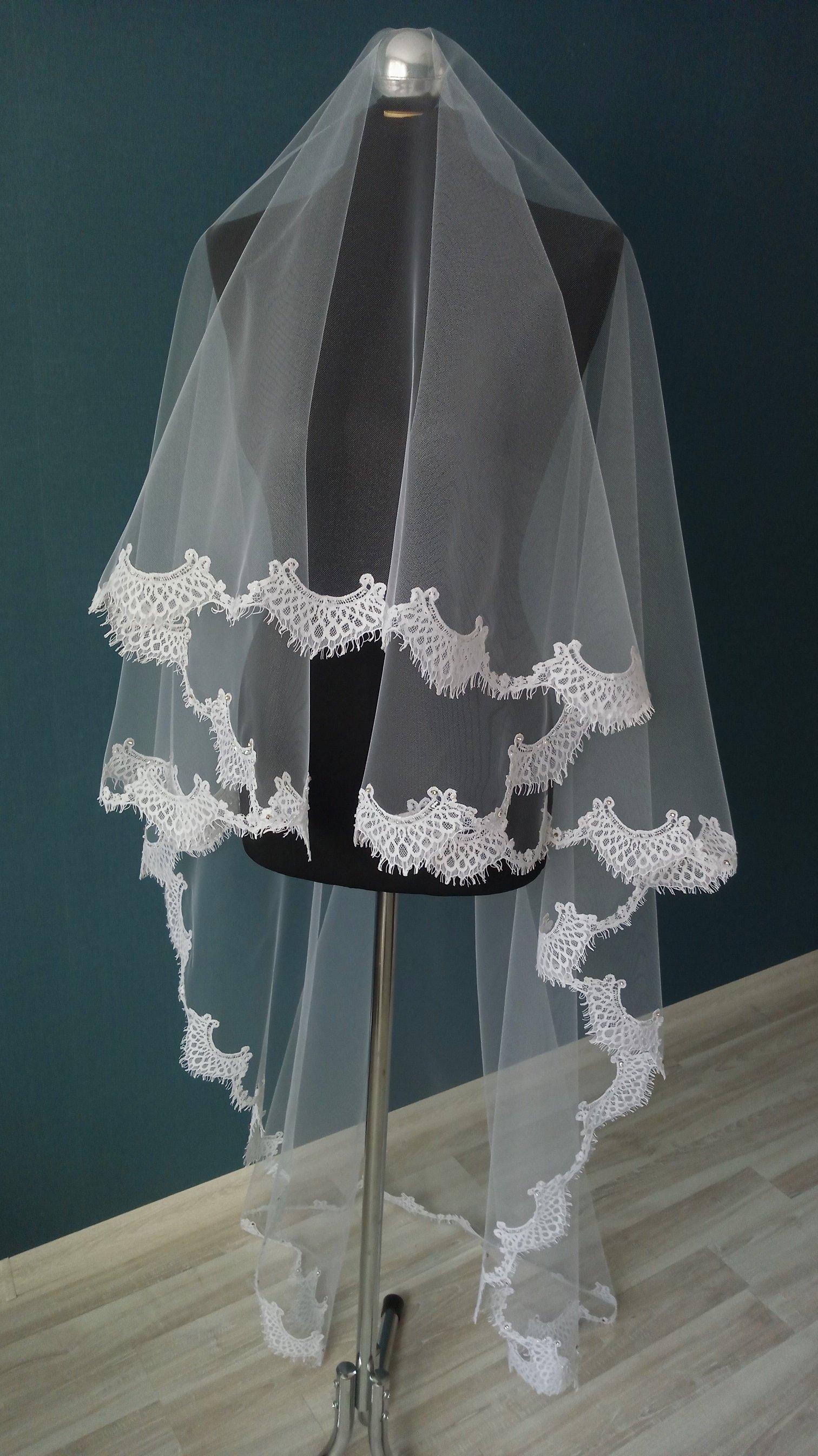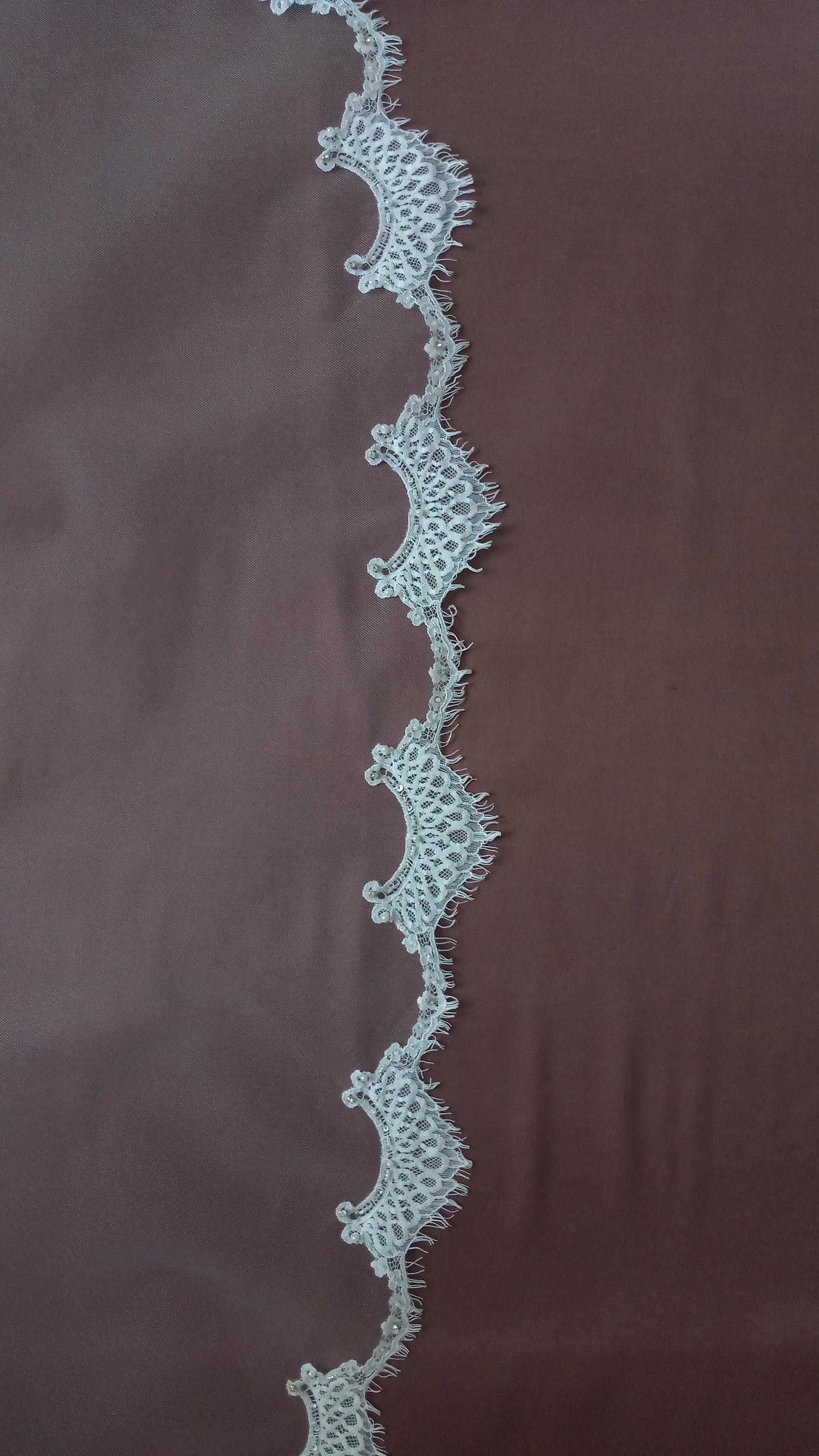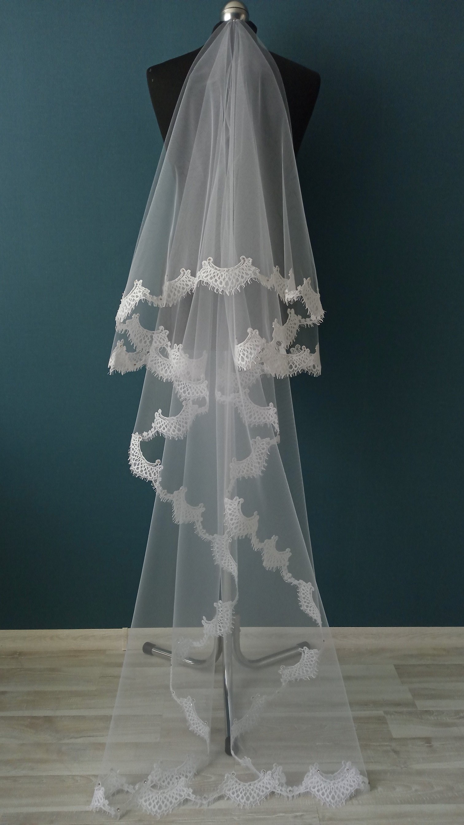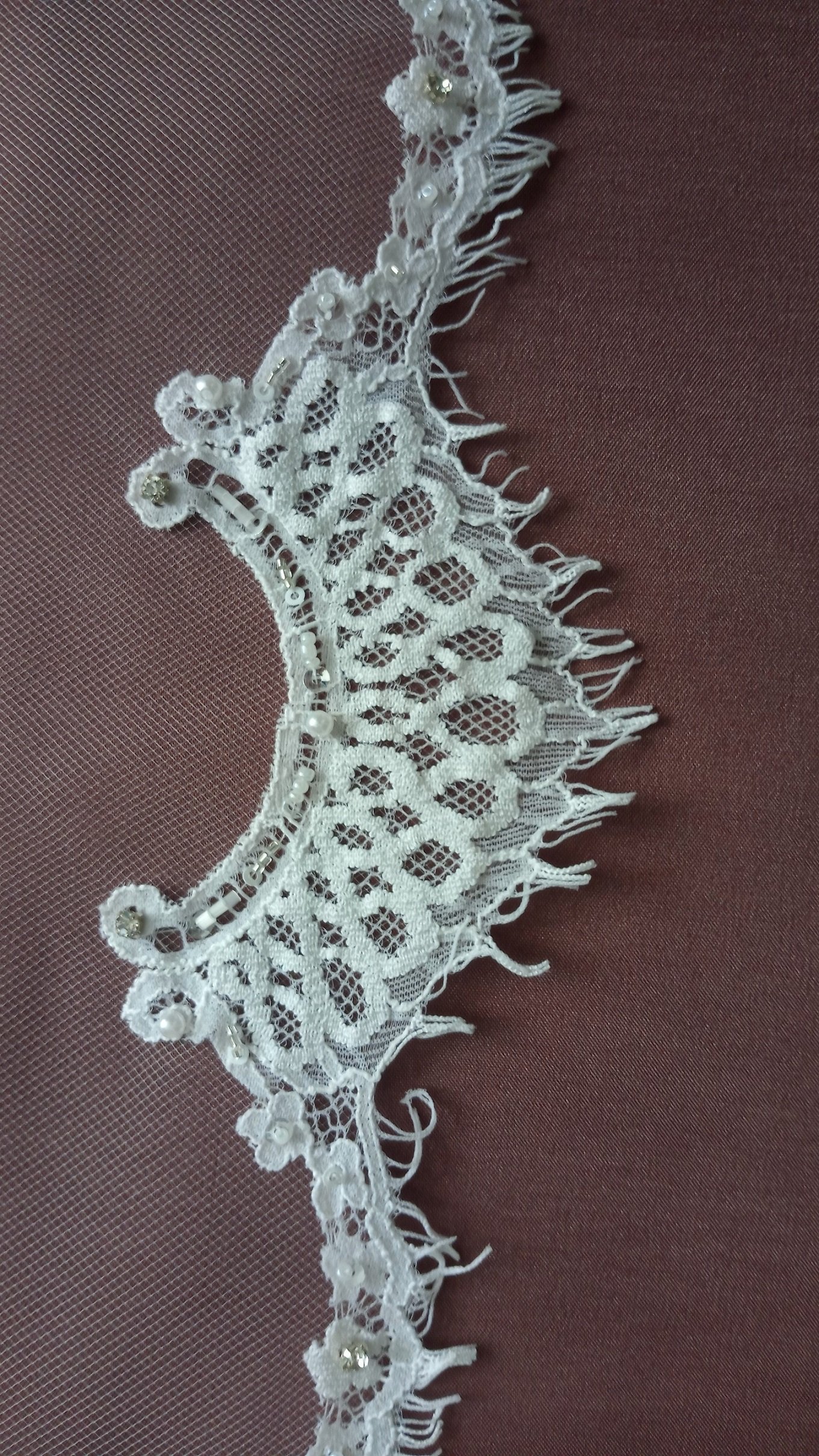 | Особенности | Фата 2-х ярусная, размер 1,5х2,3 метра ( длина верхнего слоя - 60 см, нижнего - 170 см ). Оформлена кружевом "шантильи", вручную расшита бисером,бусинами,паетками и стразами. |