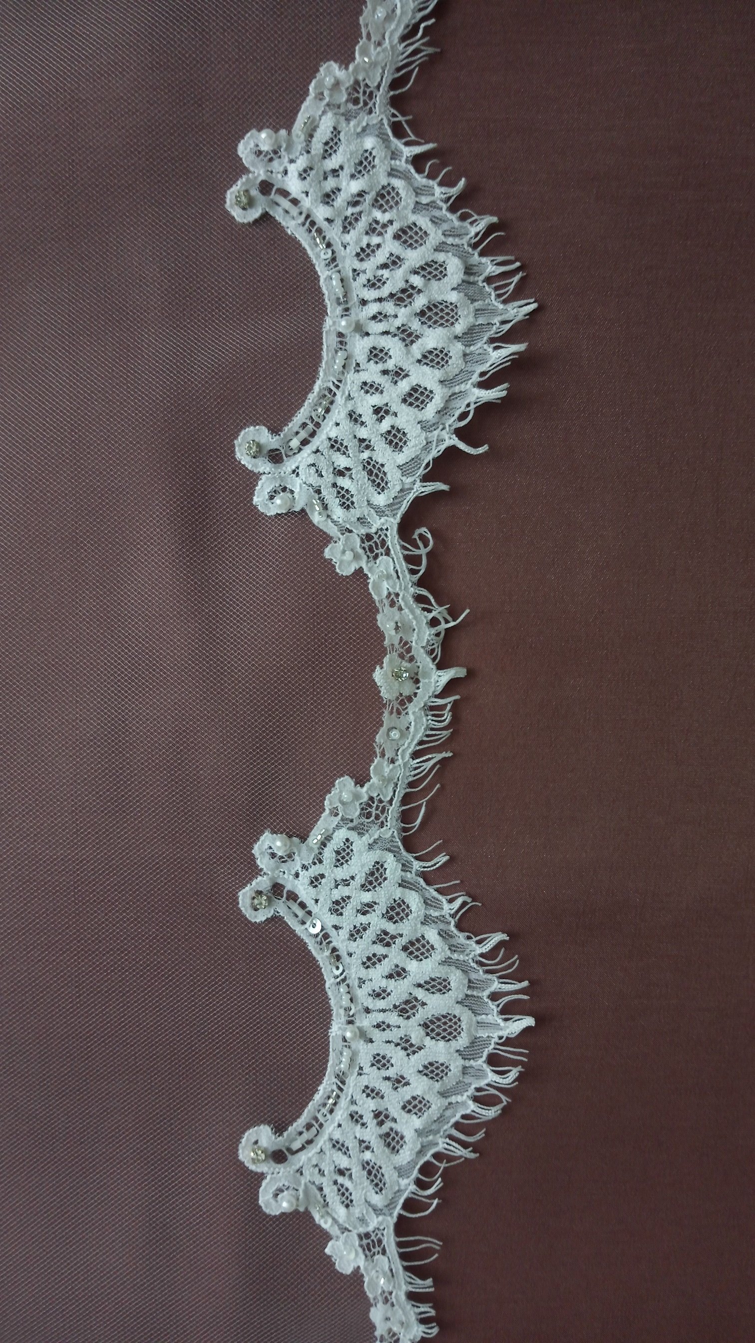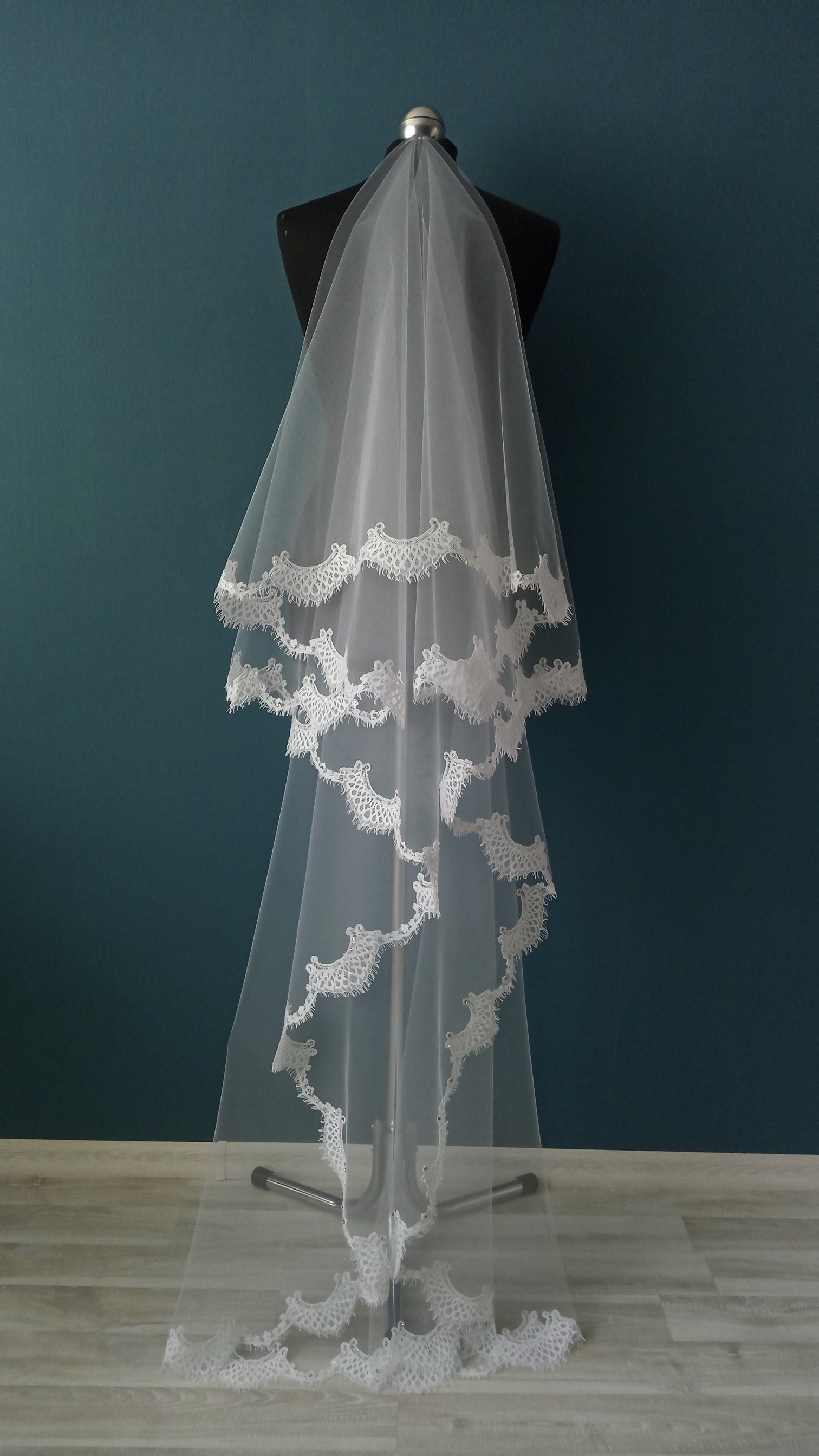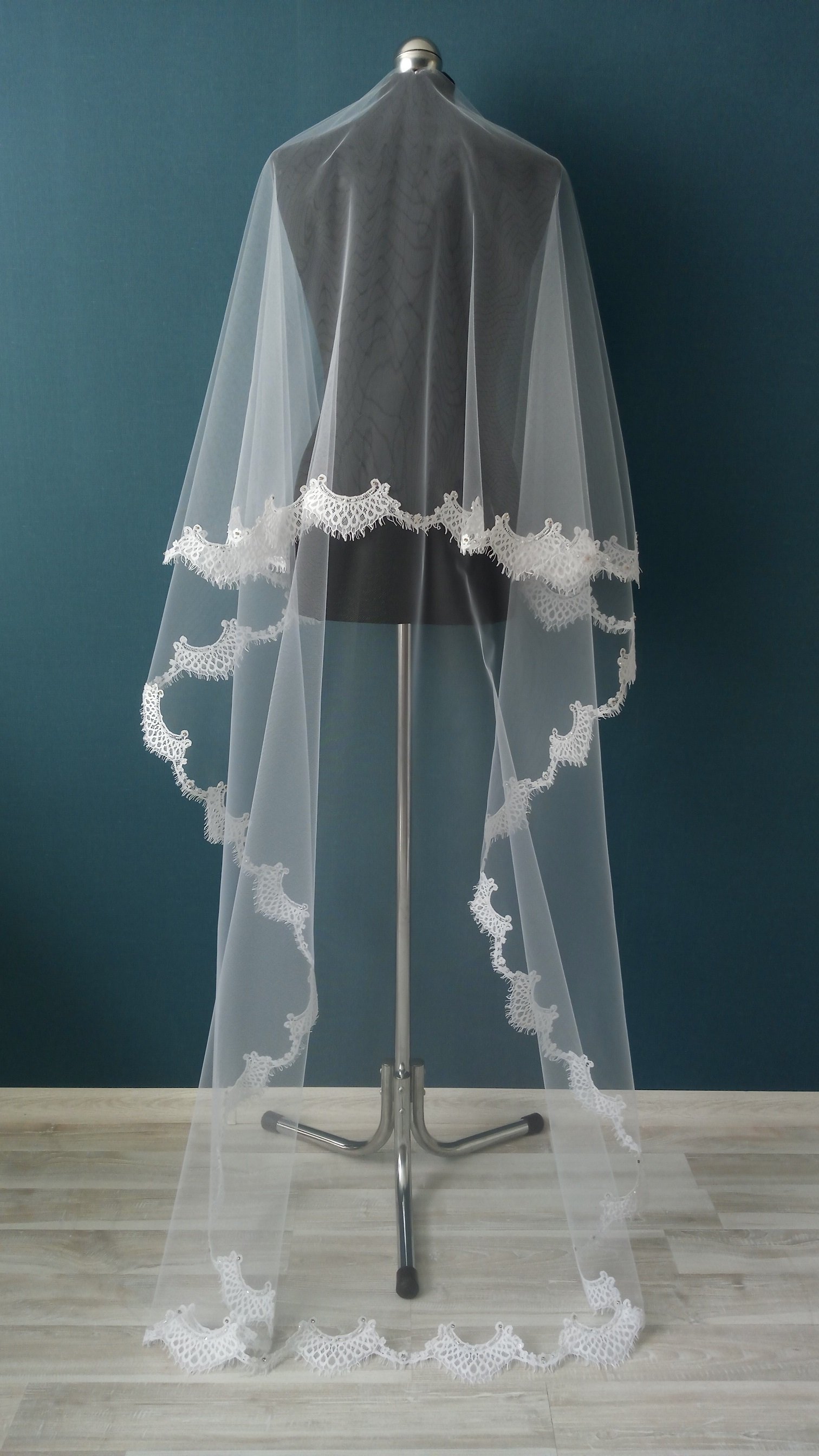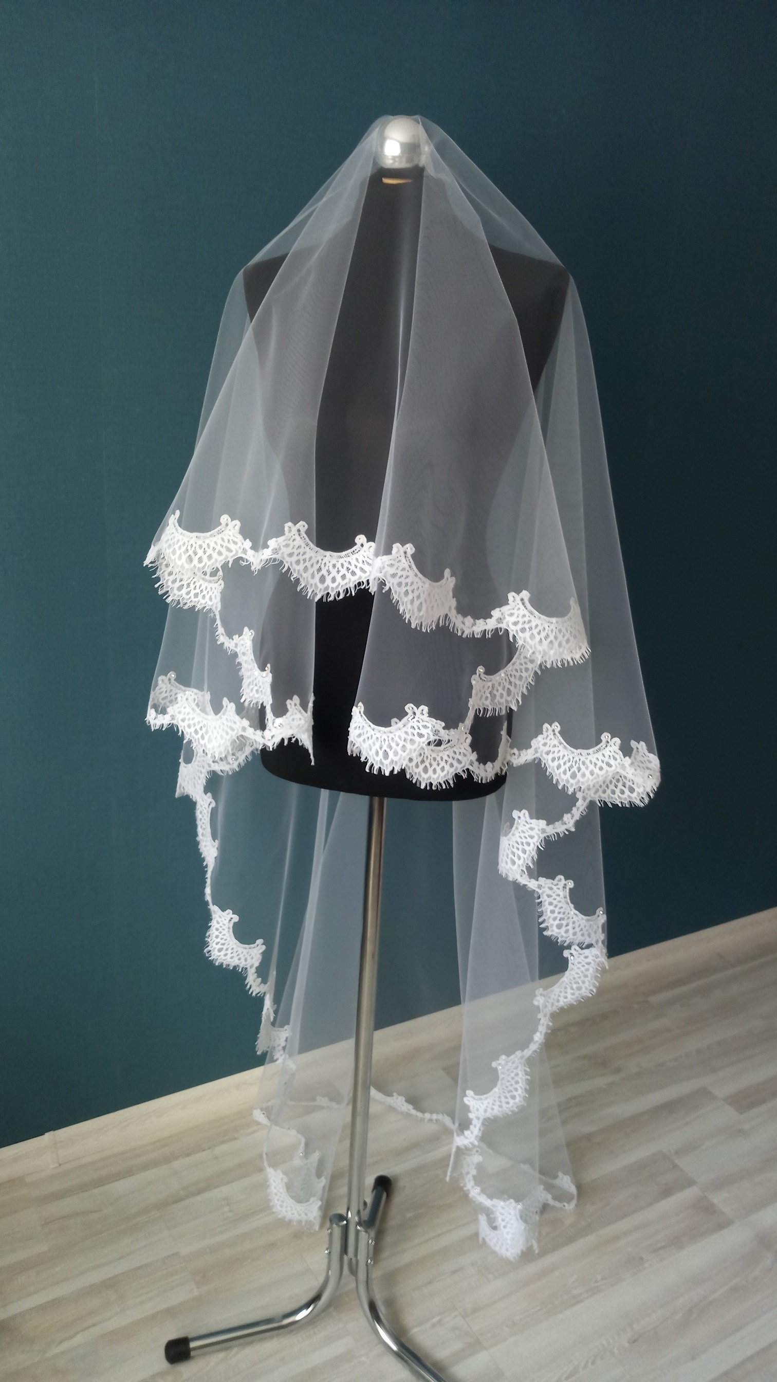 | Особенности | Фата 2-х ярусная, размер 1,5х2,3 метра ( длина верхнего слоя - 60 см, нижнего - 170 см ). Оформлена кружевом "шантильи", вручную расшита бисером,бусинами,паетками и стразами. |