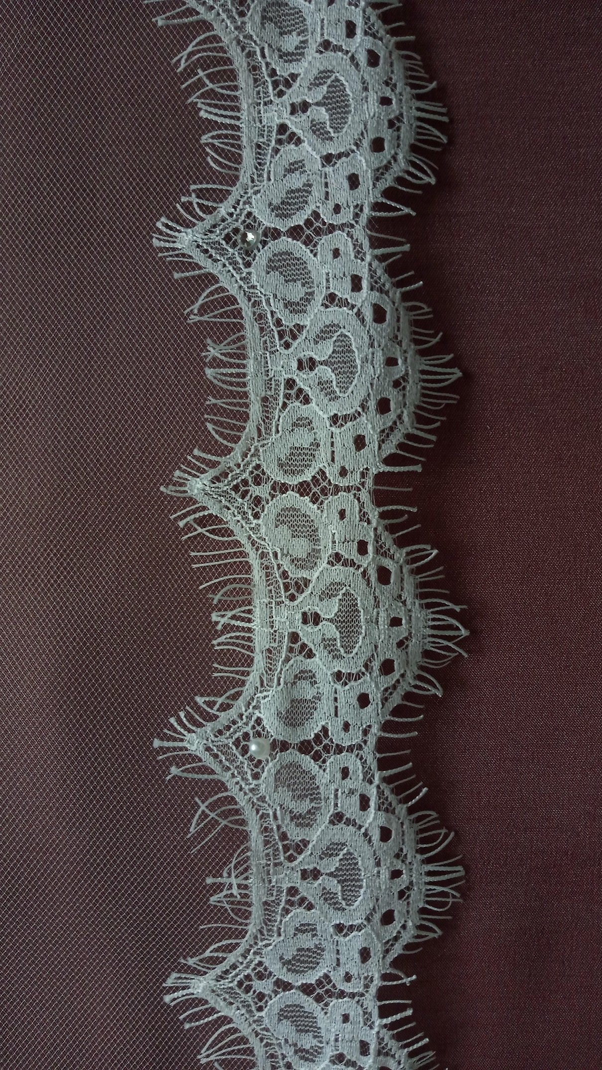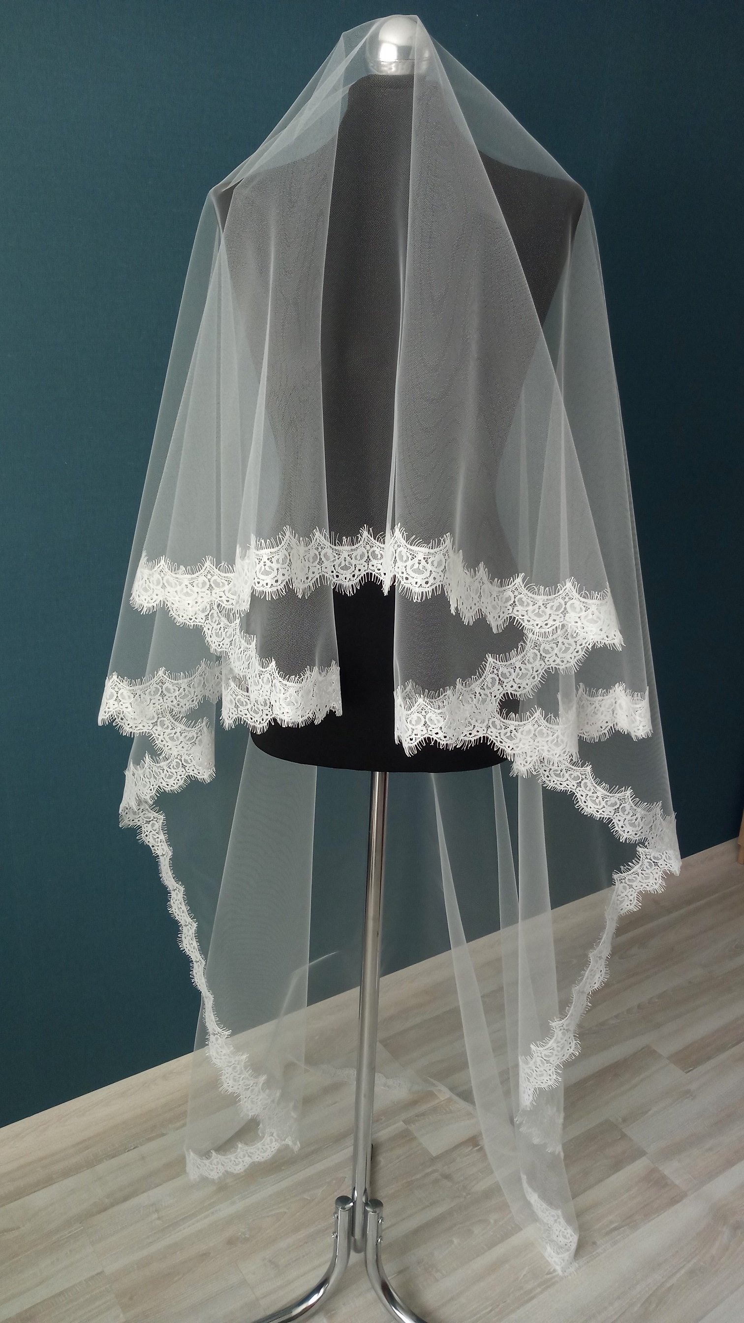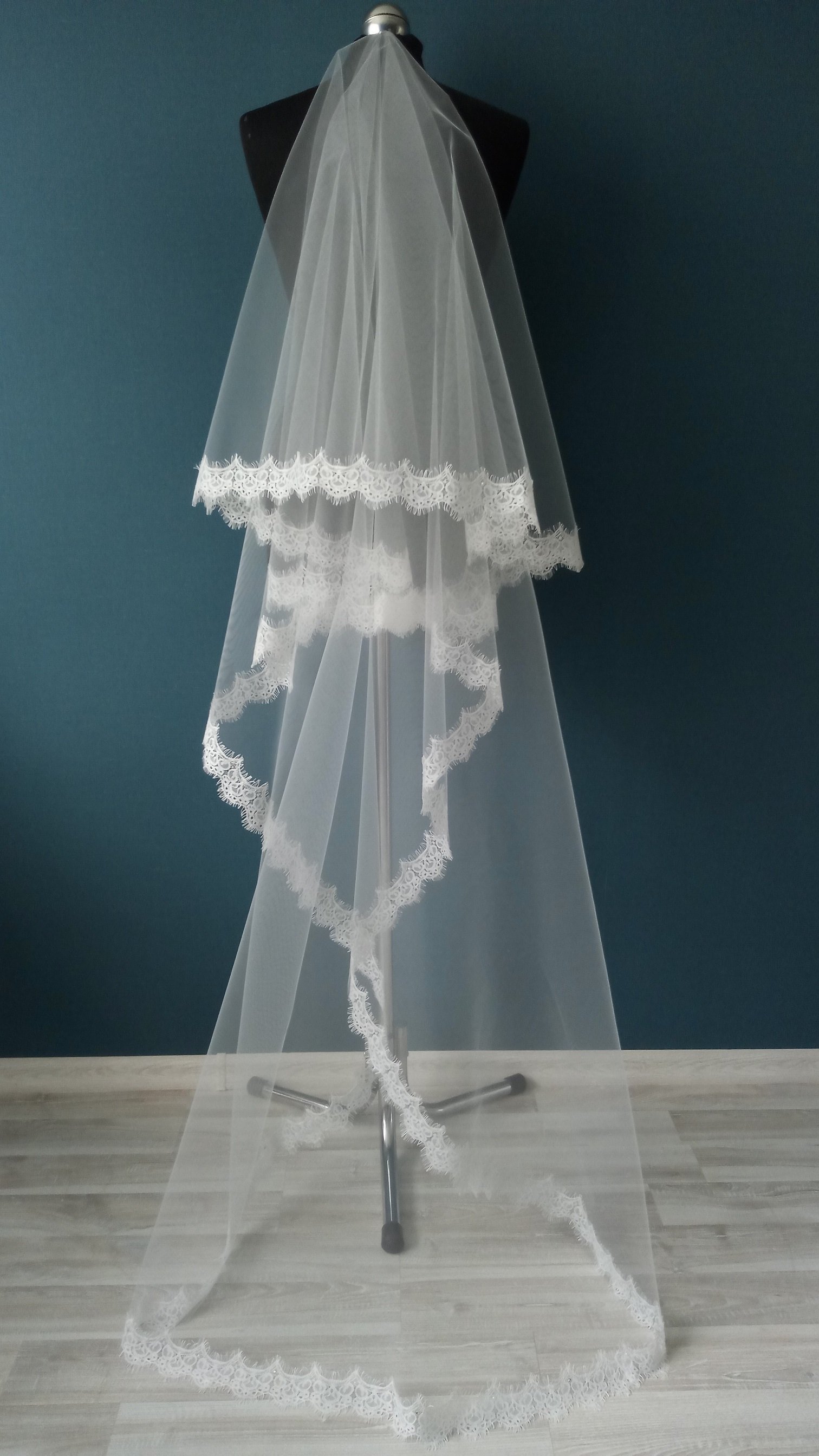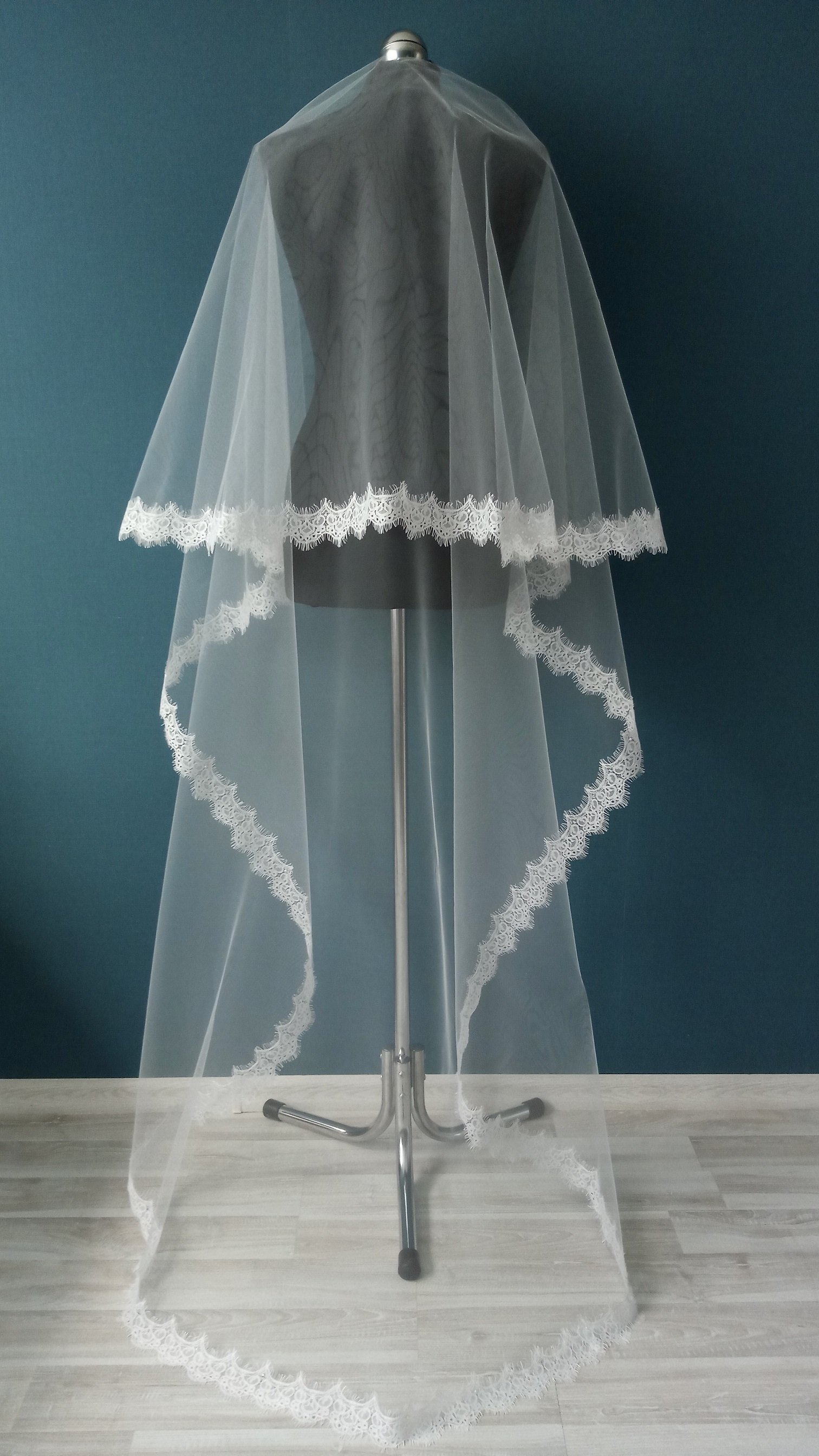 | Особенности | Фата 2-х ярусная, размер 1,5х2,3 метра ( длина верхнего слоя - 60 см, нижнего - 170 см ). Оформлена кружевом "шантильи" и украшена стразами,жемчугом. |