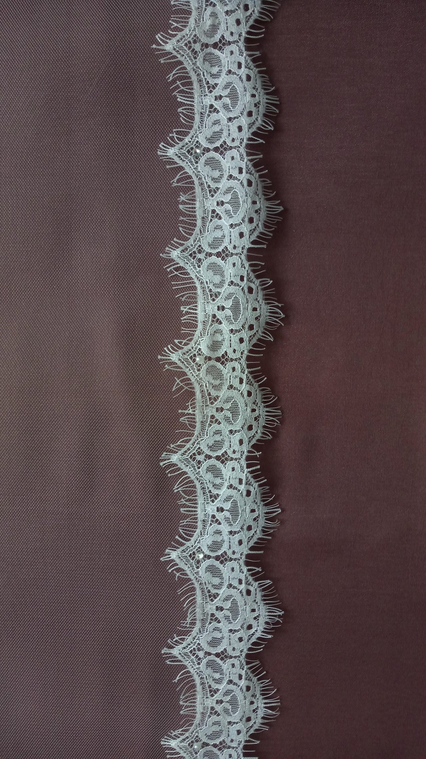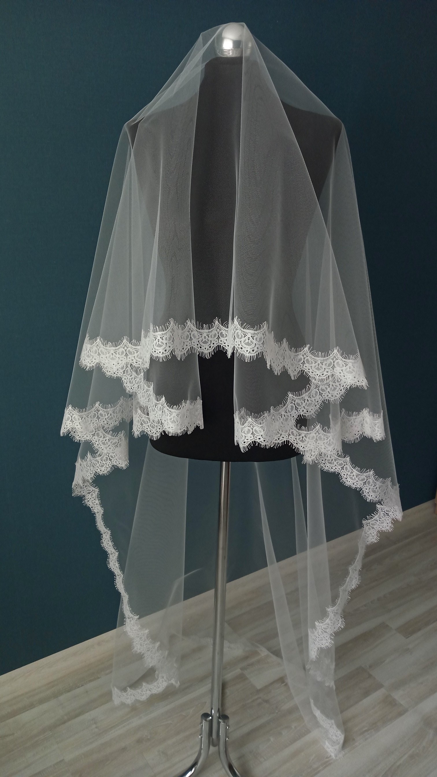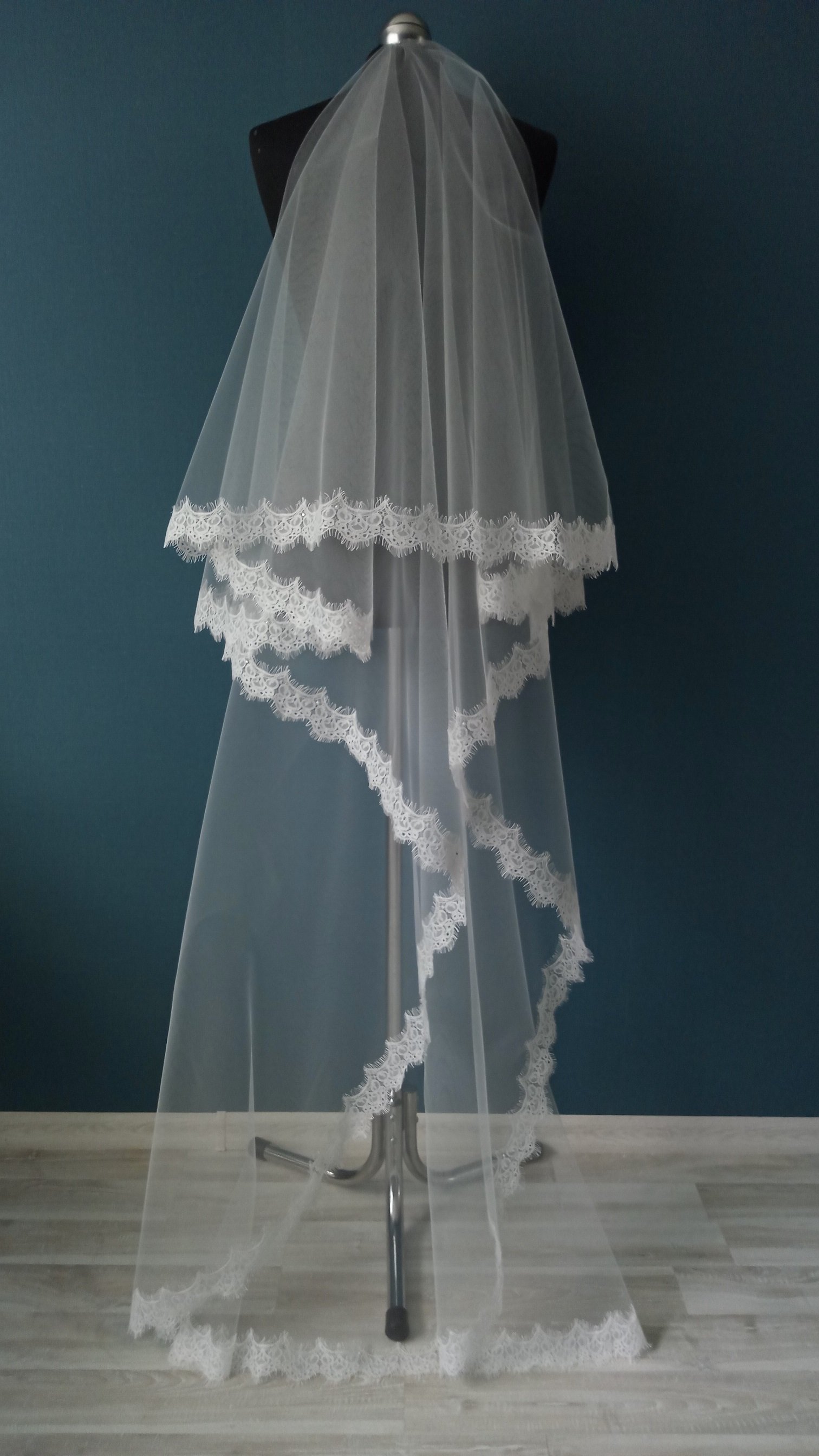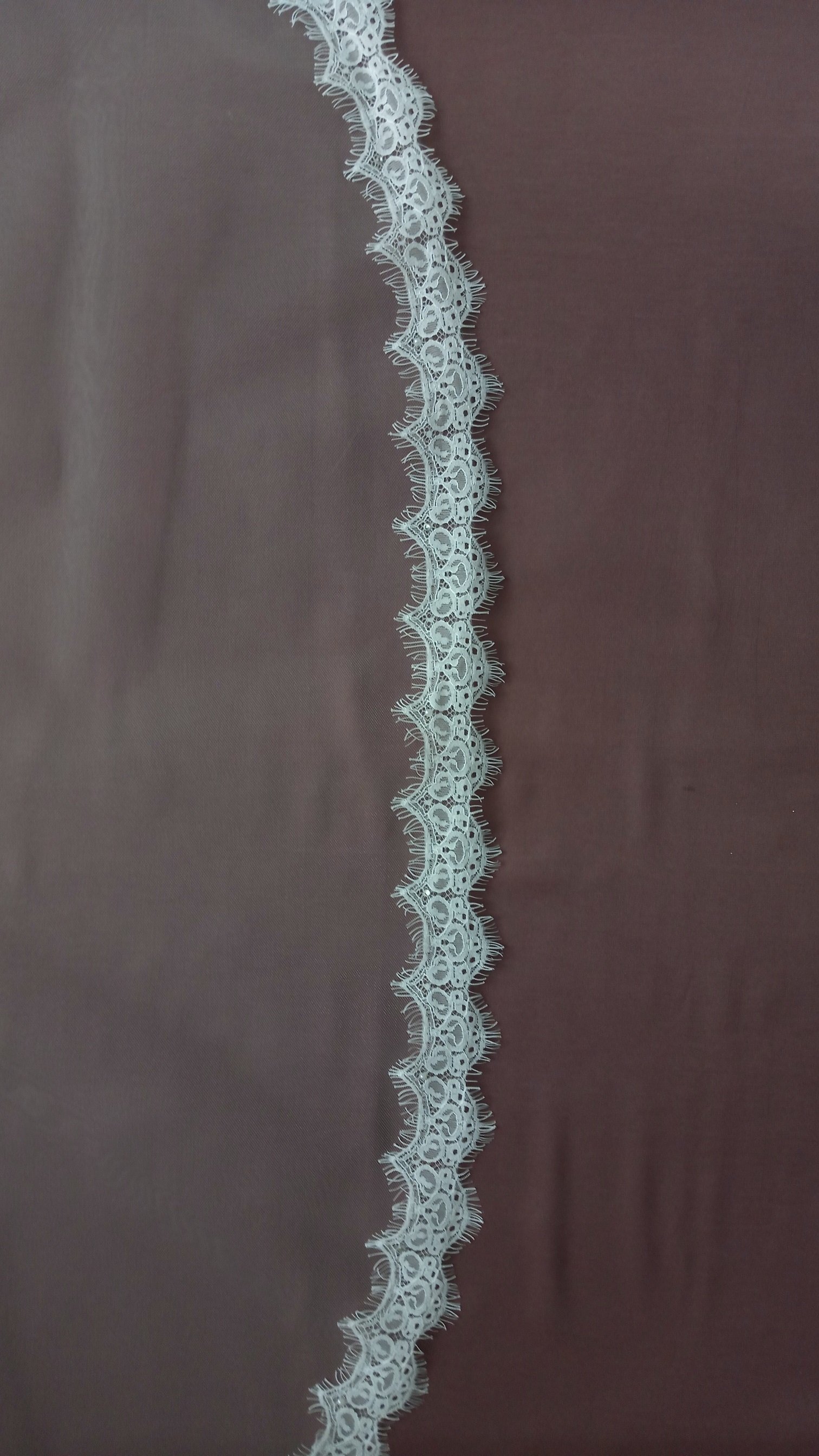 | Особенности | Фата 2-х ярусная, размер 1,5х2,3 метра ( длина верхнего слоя - 60 см, нижнего - 170 см ). Оформлена кружевом "шантильи" и украшена стразами,жемчугом. |