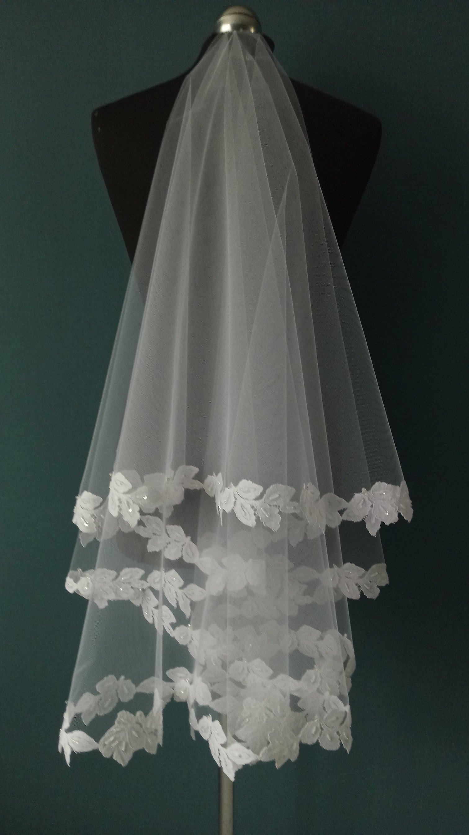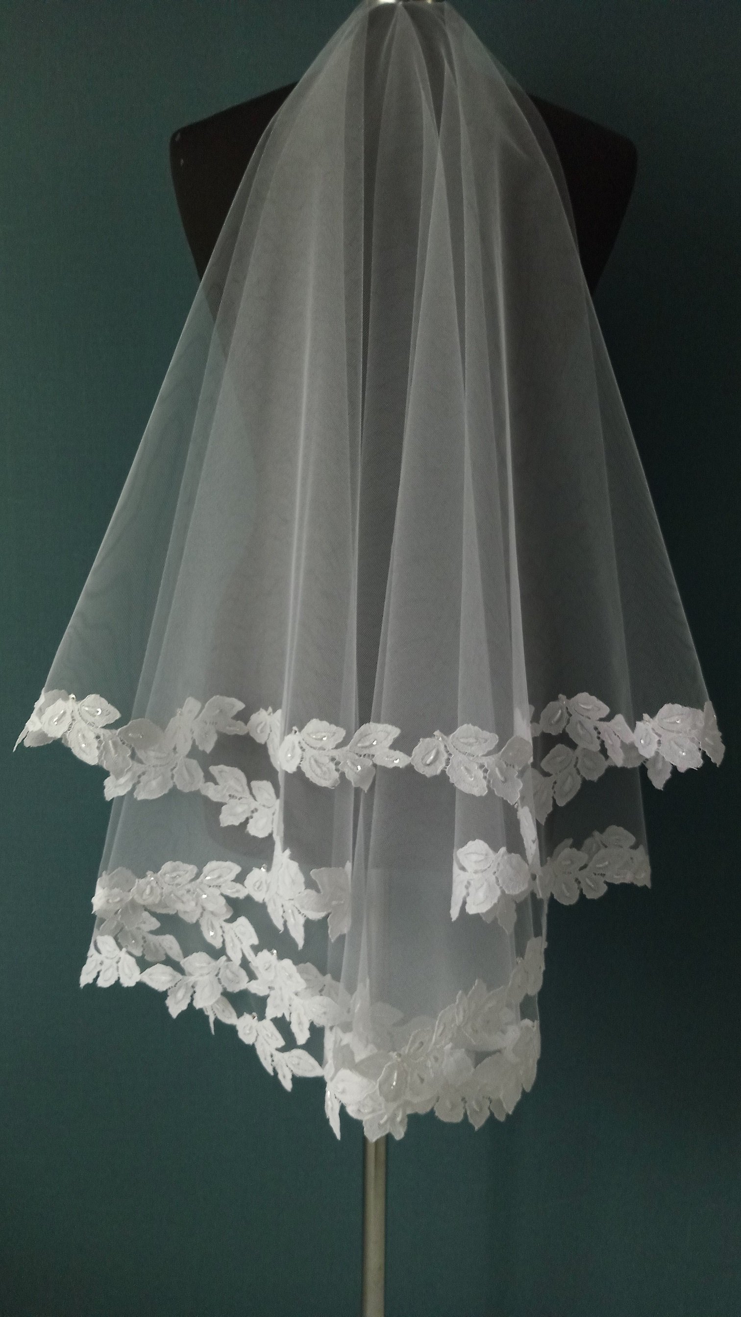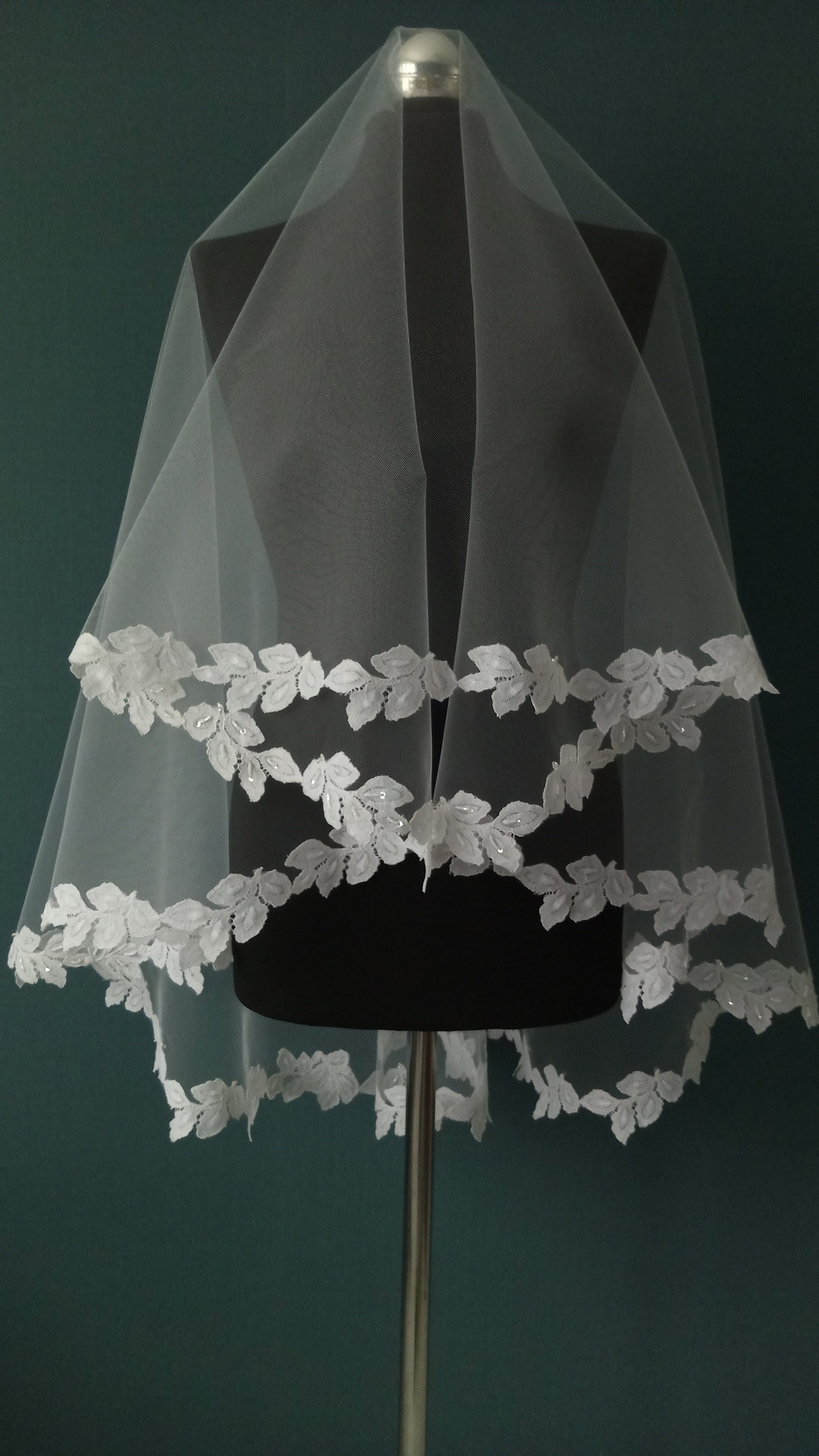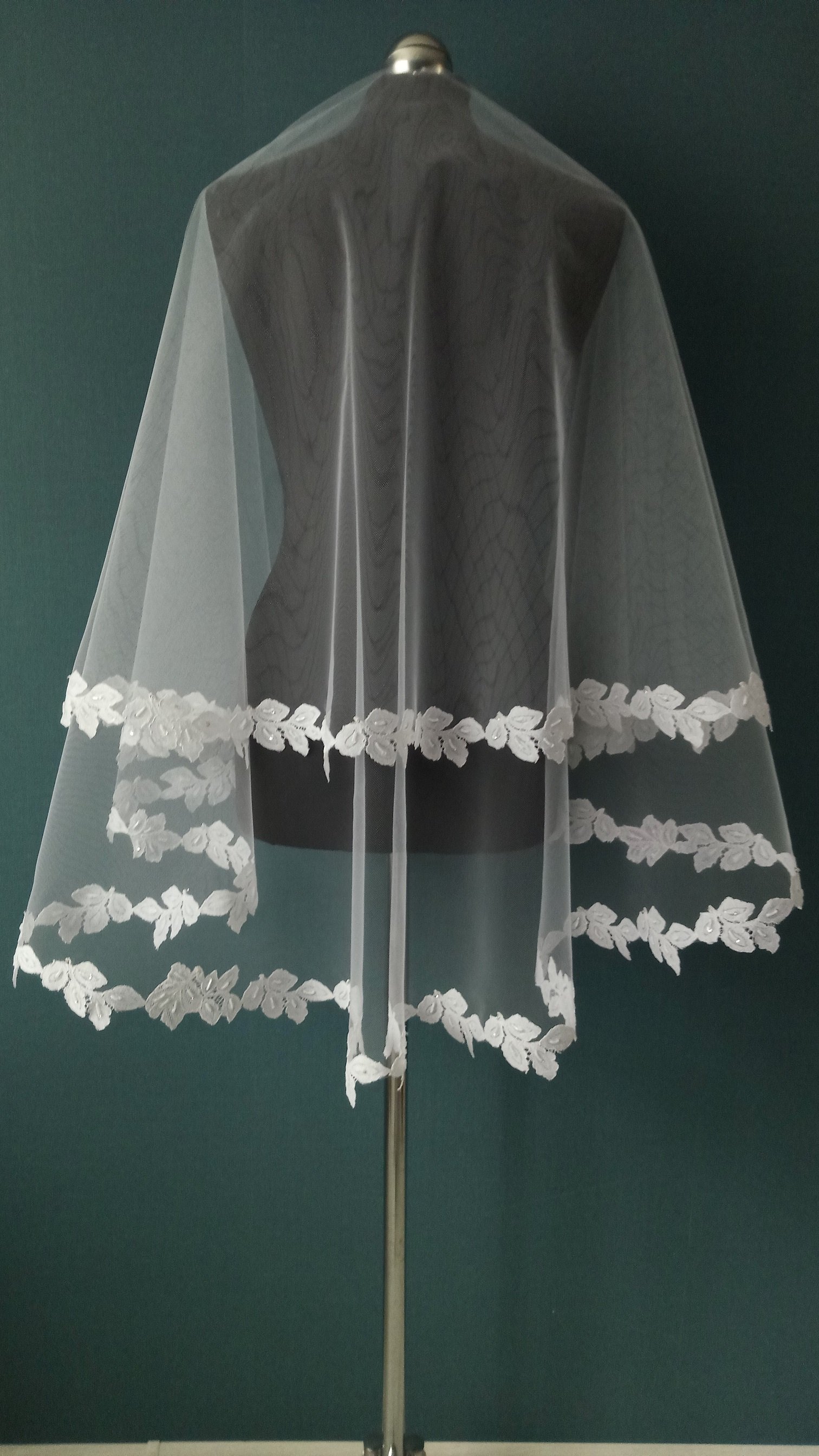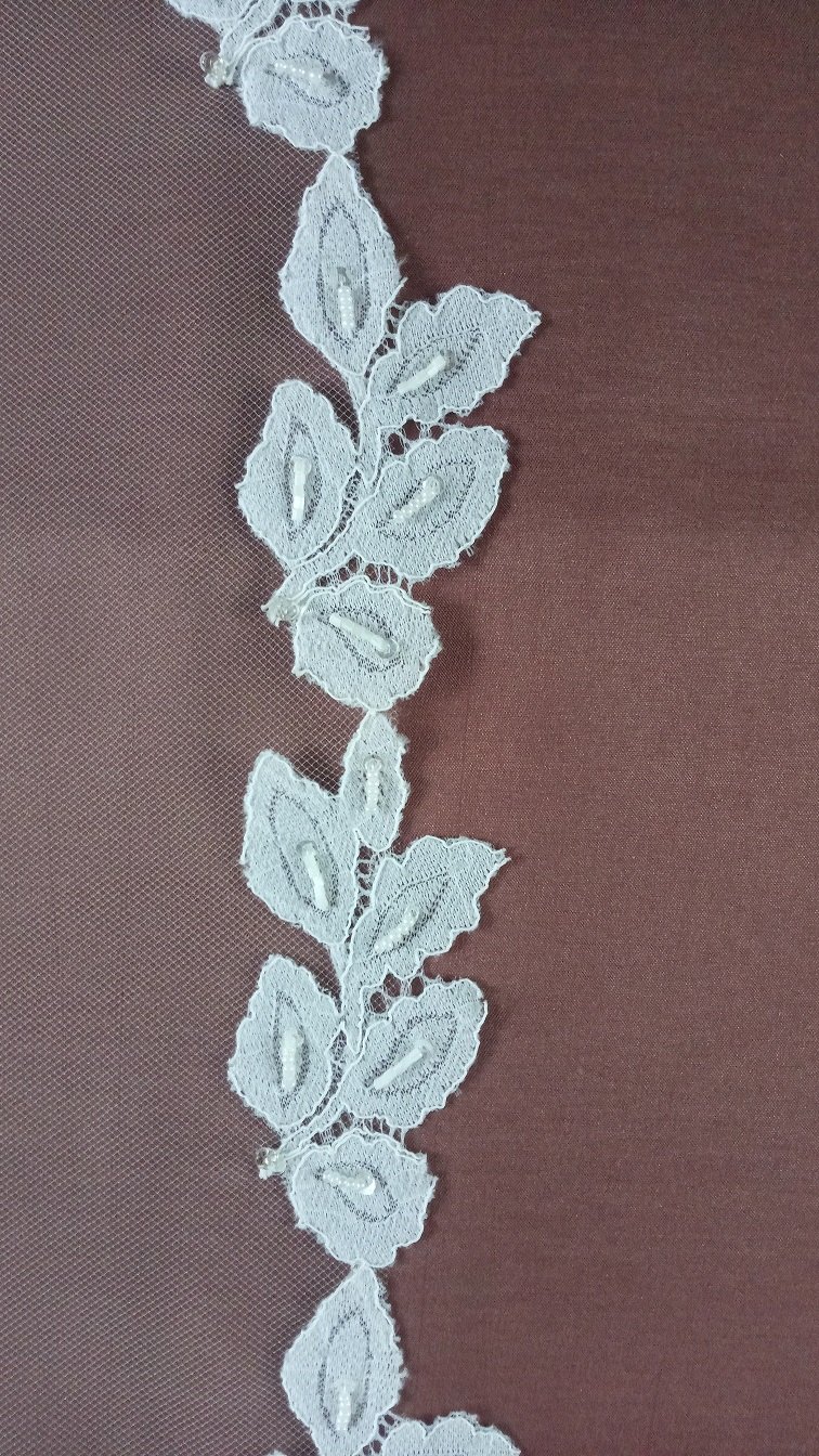 | Особенности | Фата 2-х ярусная белого цвета,размер 1,5х1,5 метра ( длина верхнего слоя - 60 см,нижнего - 90 см ). Фата оформлена кружевом "шантильи" с тонкой кордовой нитью и вручную расшита бисером,бусинами,паетками. |
