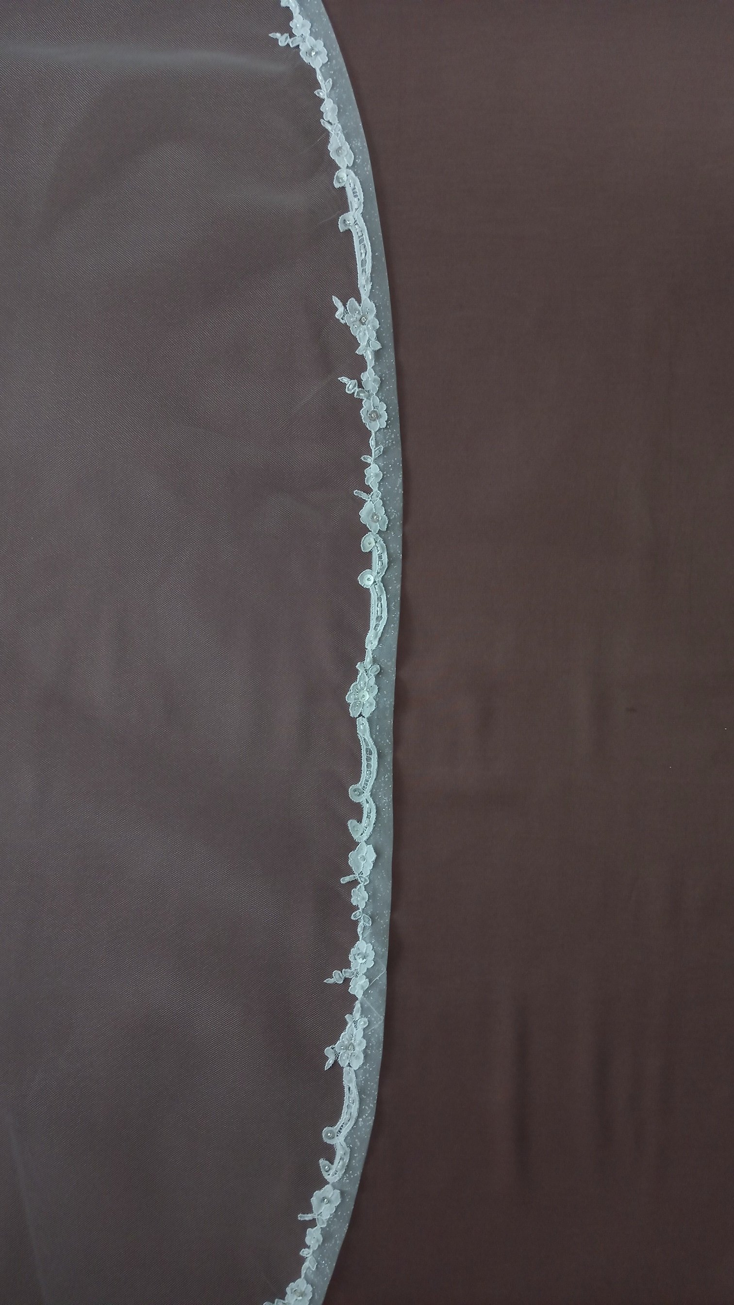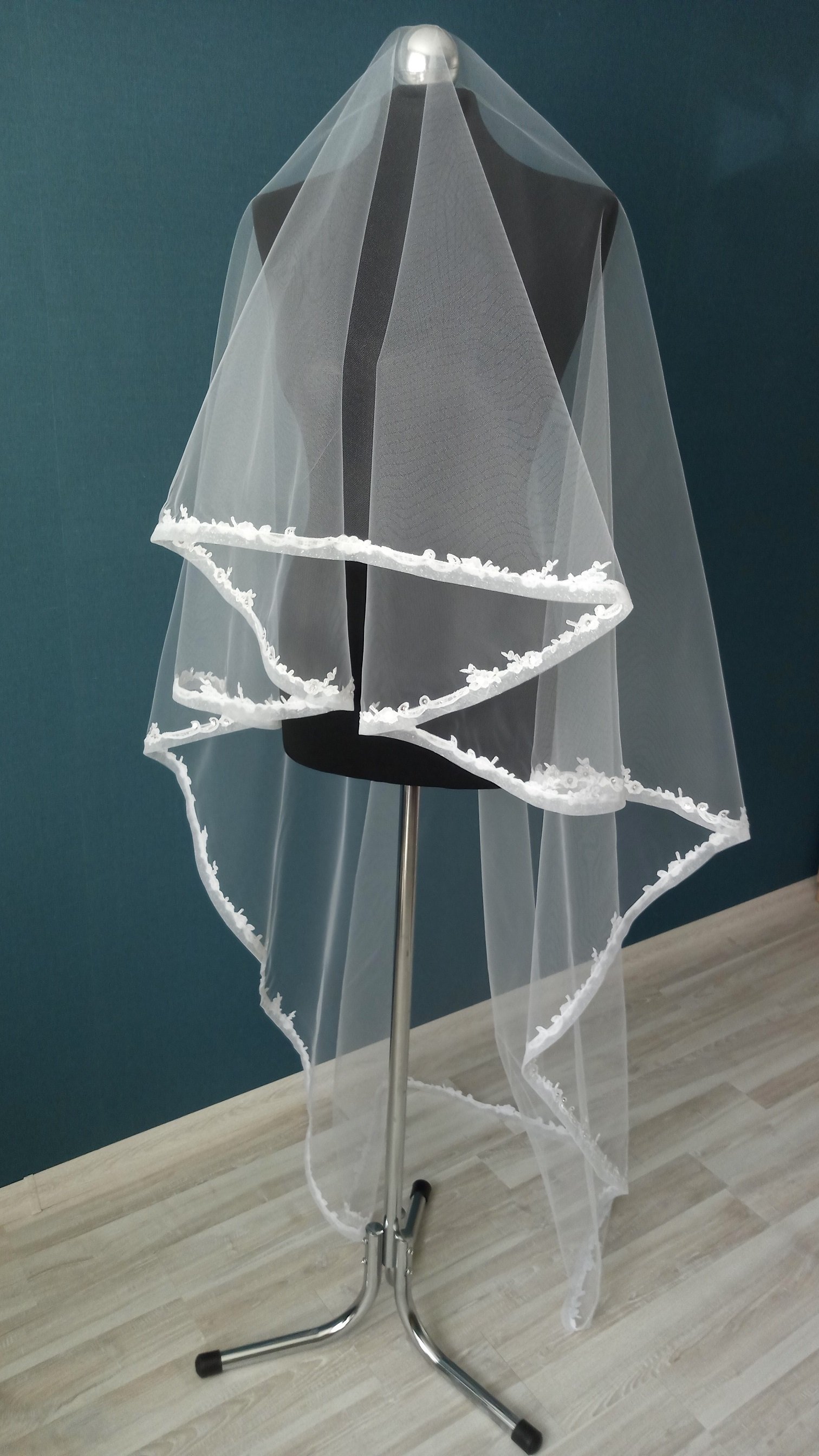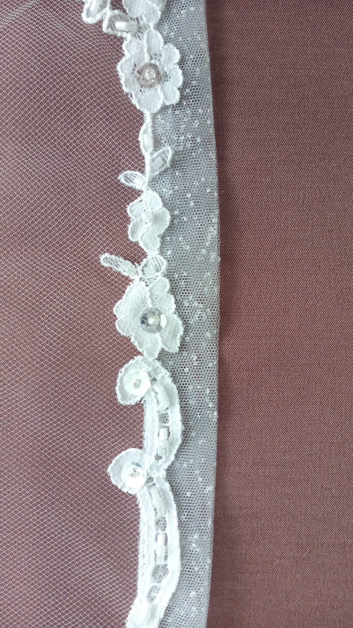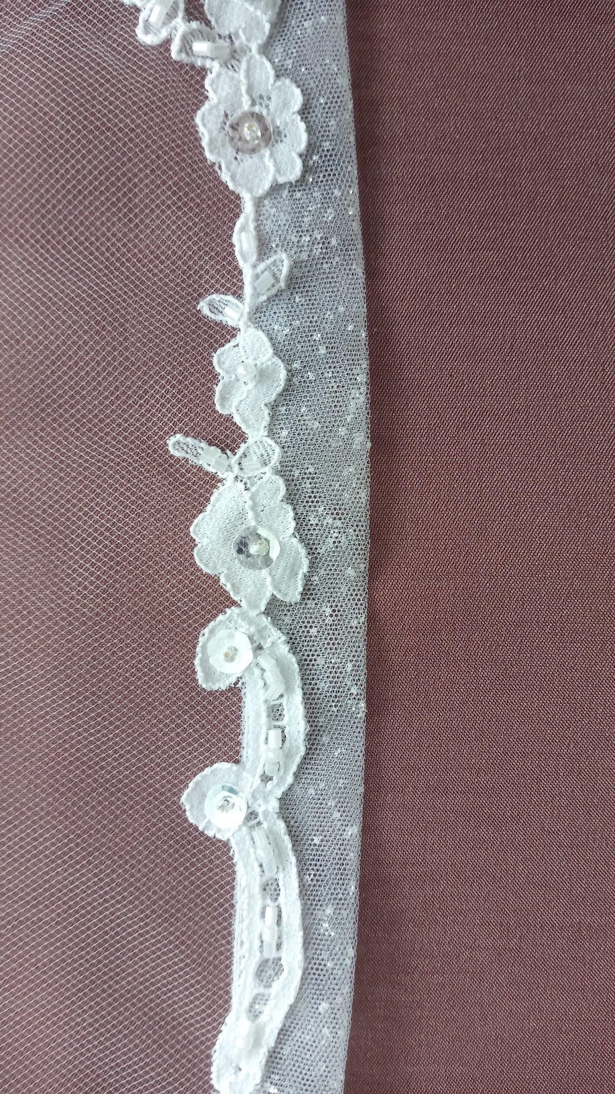 | Особенности | Фата 2-х ярусная, размер 1,5х2,3 метра ( длина верхнего слоя - 60 см, нижнего - 170 см ). Фата окантована косой бейкой из глиттерного фатина и оформлена кружевом "шантильи" вручную расшитым бисером,бусинами и паетками. |