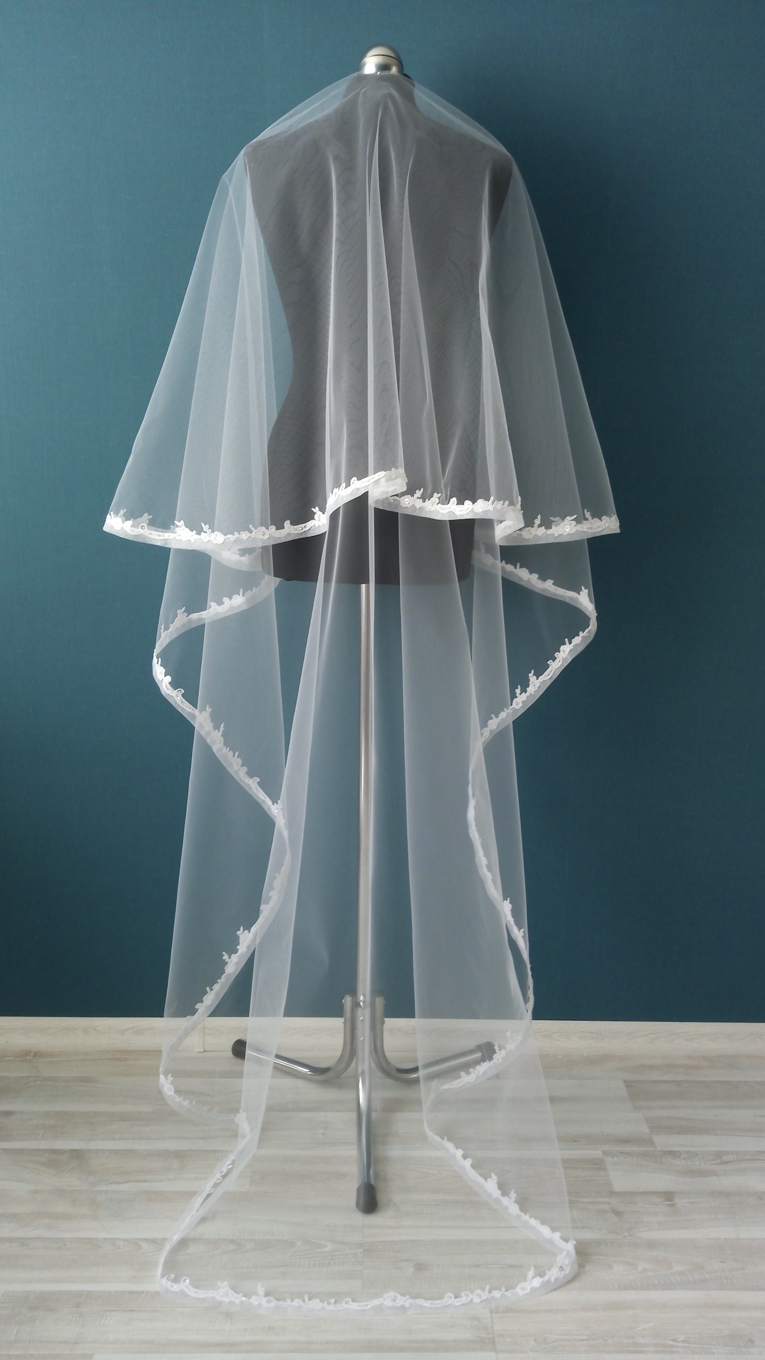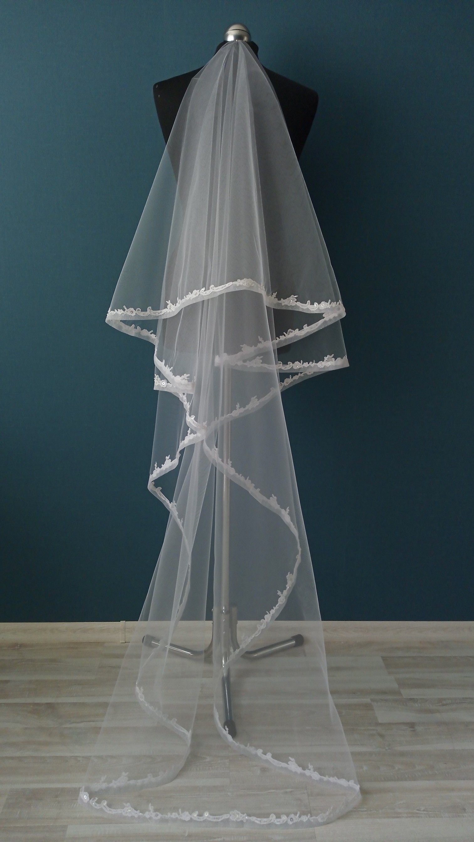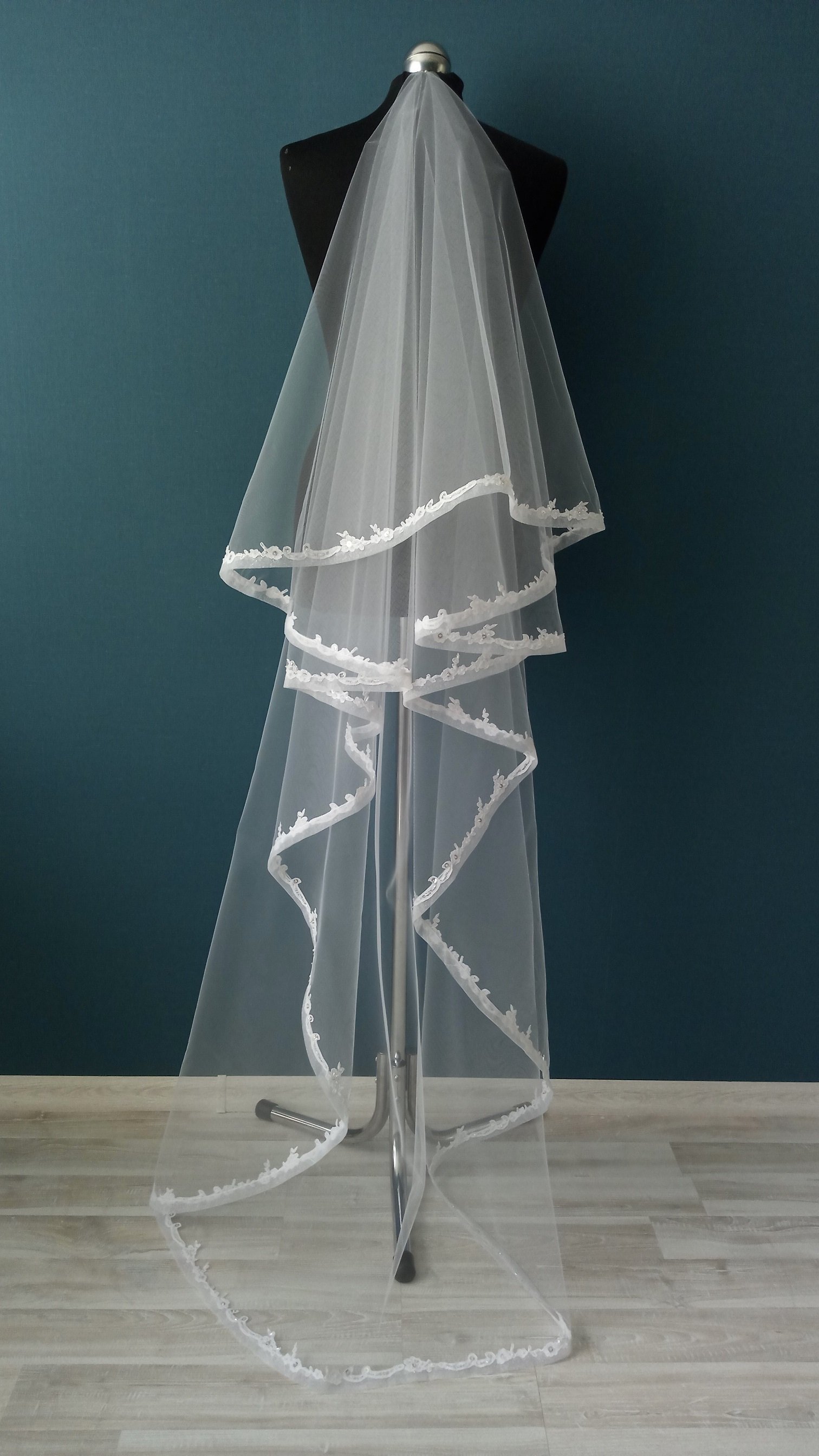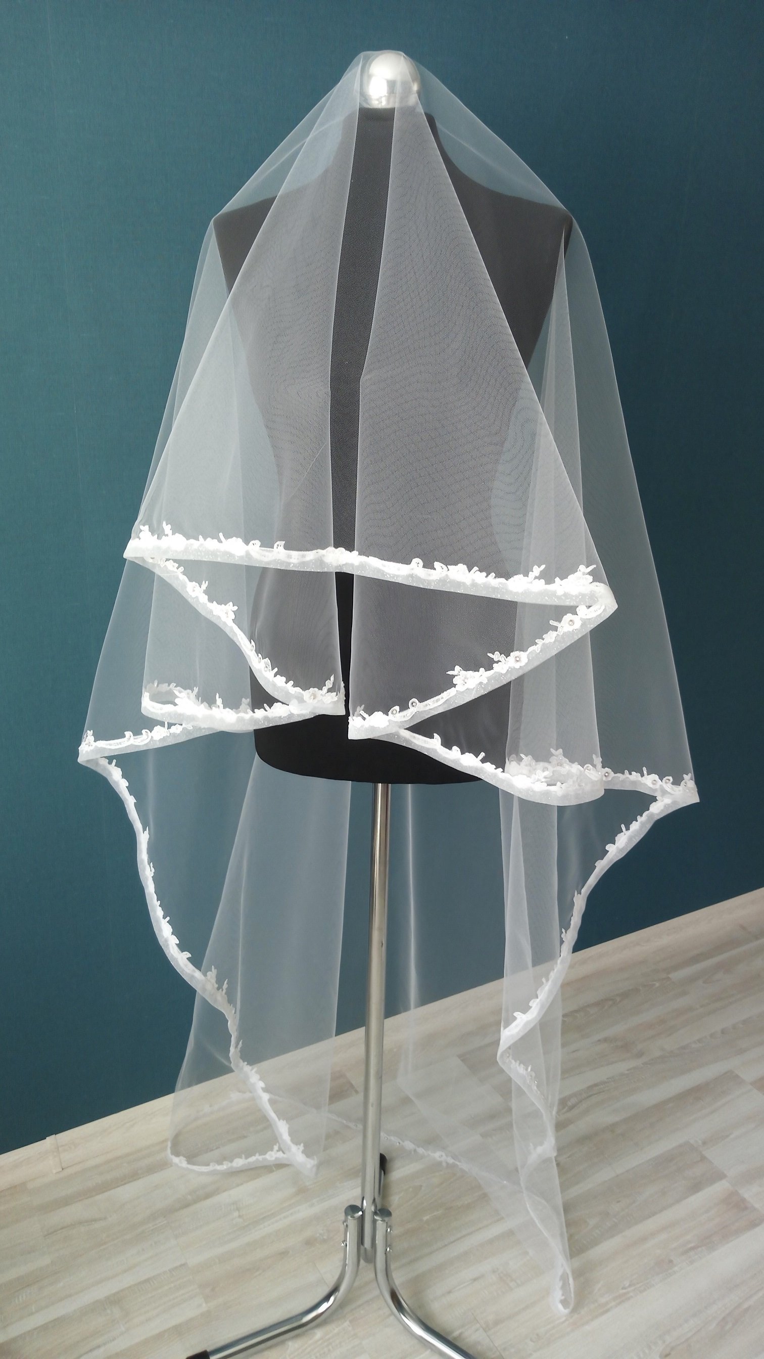 | Особенности | Фата 2-х ярусная, размер 1,5х2,3 метра ( длина верхнего слоя - 60 см, нижнего - 170 см ). Фата окантована косой бейкой из глиттерного фатина и оформлена кружевом "шантильи" вручную расшитым бисером,бусинами и паетками. |